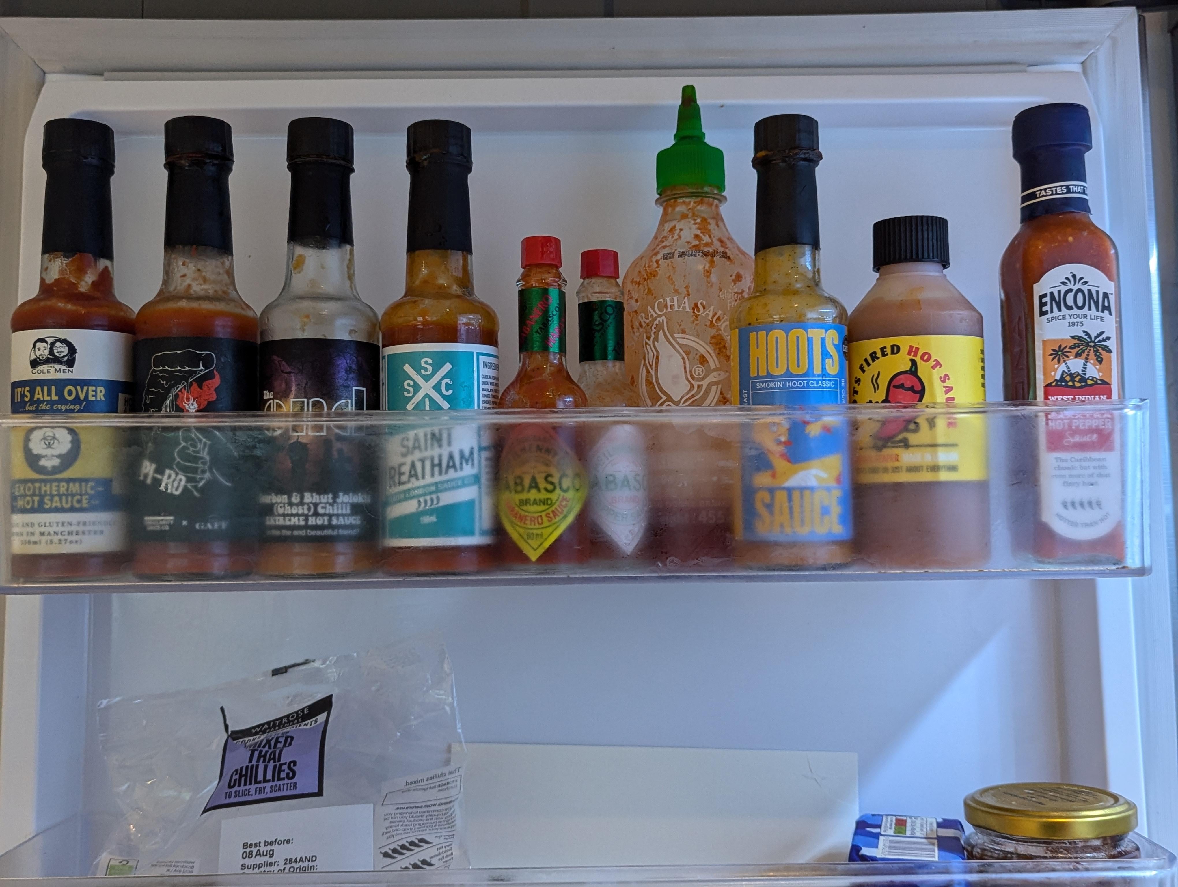 Current fridge situation – a solid line-up (Tabasco usually lives in the cupboard but moved over for the photo op) by KingSizeMicrobe hot sauceSauceWrite A CommentYou must be logged in to post a comment.