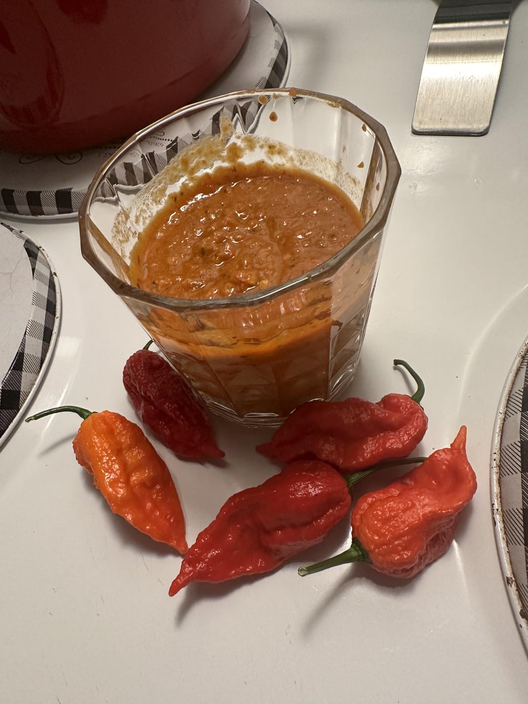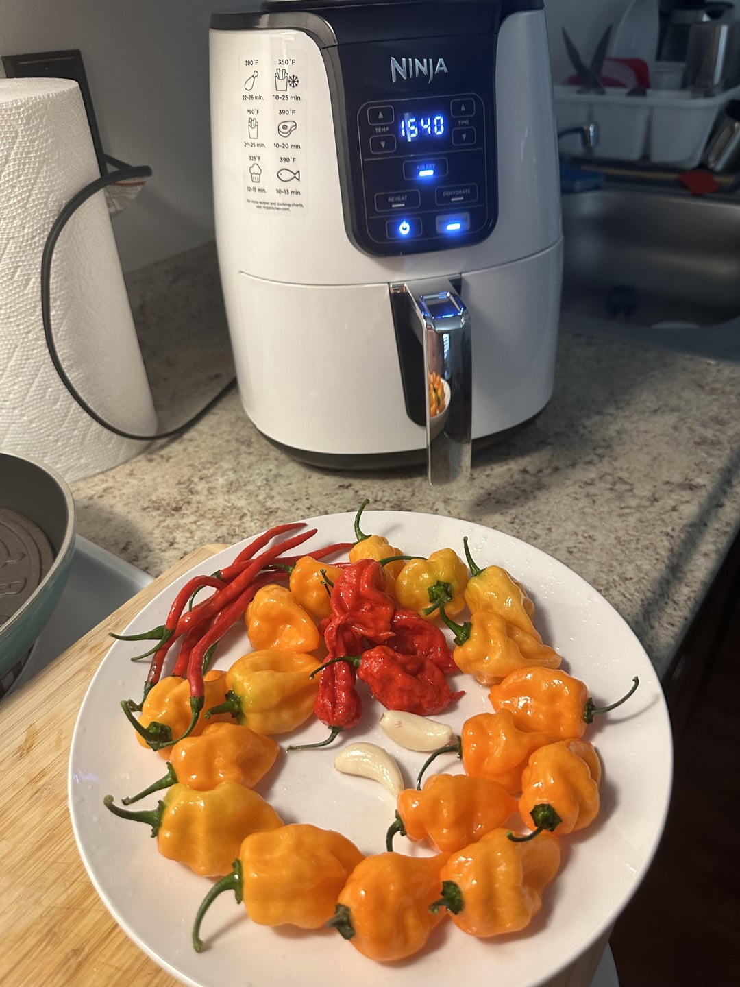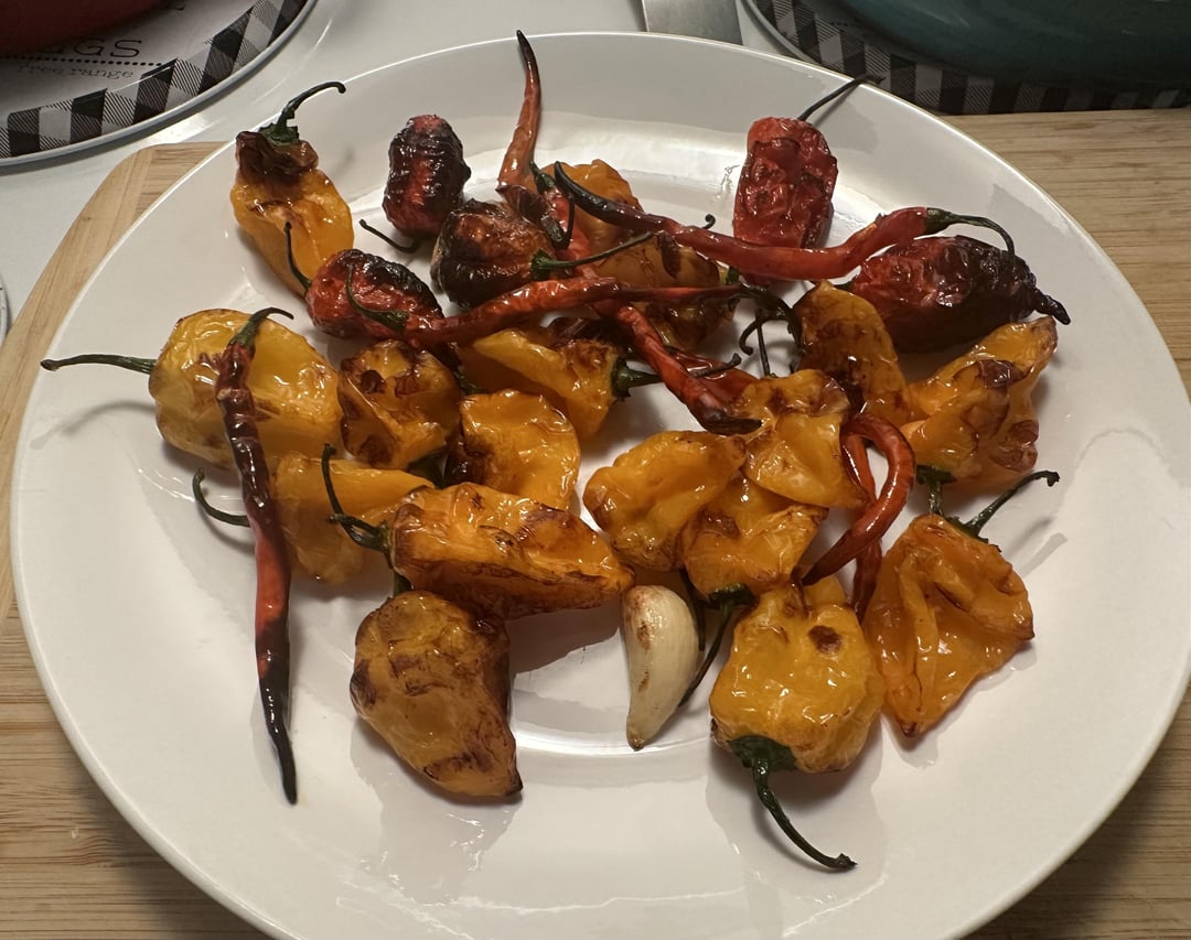 Peppers: Cayenne, habanero and ghost peppers. Herbs/spice: Garlic cloves, salt, fresh rosemary, turmeric, onion powder and fresh cracked black pepper.