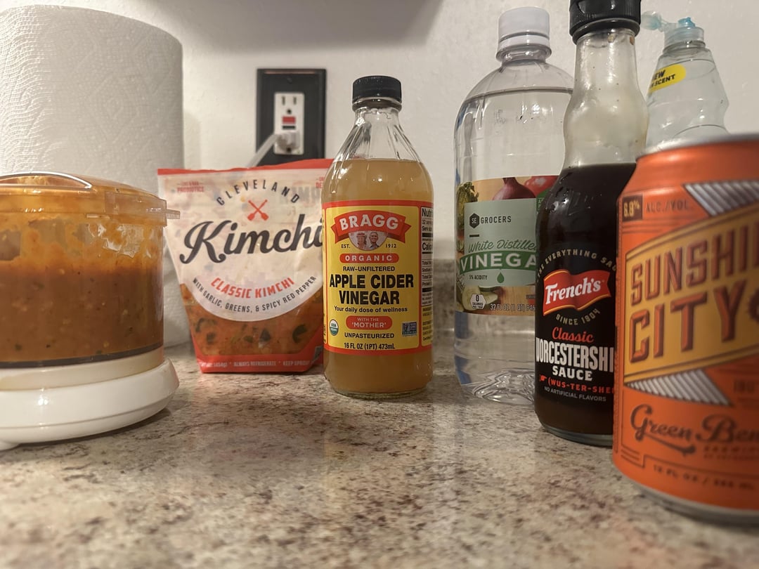 Liquid additions: apple cider vinegar, white distilled vinegar, Worcestershire sauce, kimchi liquid and a splash of IPA.