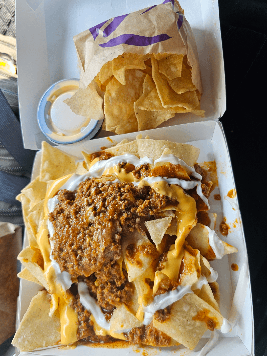 My favorite Taco Bell always makes the most beautiful nachos. When I get a fire reward, I order the Loaded Beef Nachos with No Guac & Extra Beef, then I smash my reward nachos on top and dump the nacho cheese all over it. I only do this like once a month because holy sodium, but I love it so much and it only costs about $4.