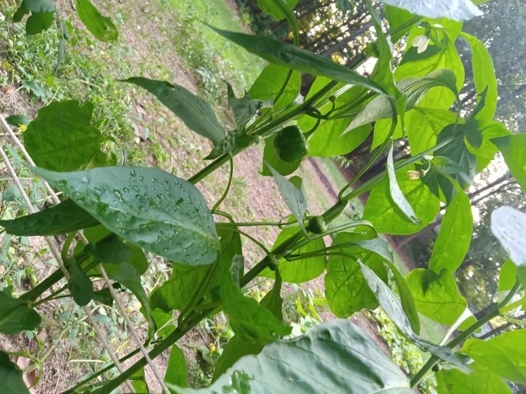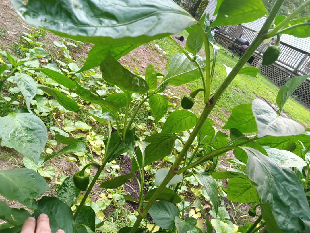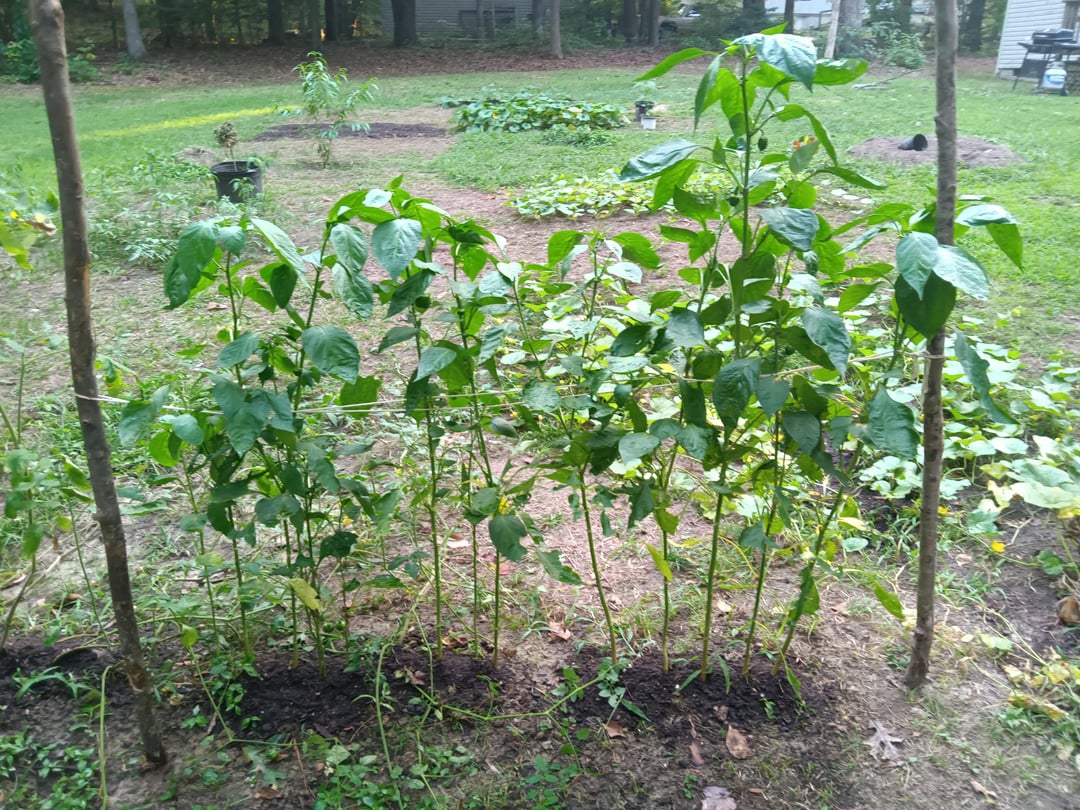 Plenty of flowers and fruit just added more compost these are organic orange peppers just planted in pure compost no chemicals most of them are volunteers I believe stalks as big as my pink and biggest one is a little over 5 foot just a head shorter than me