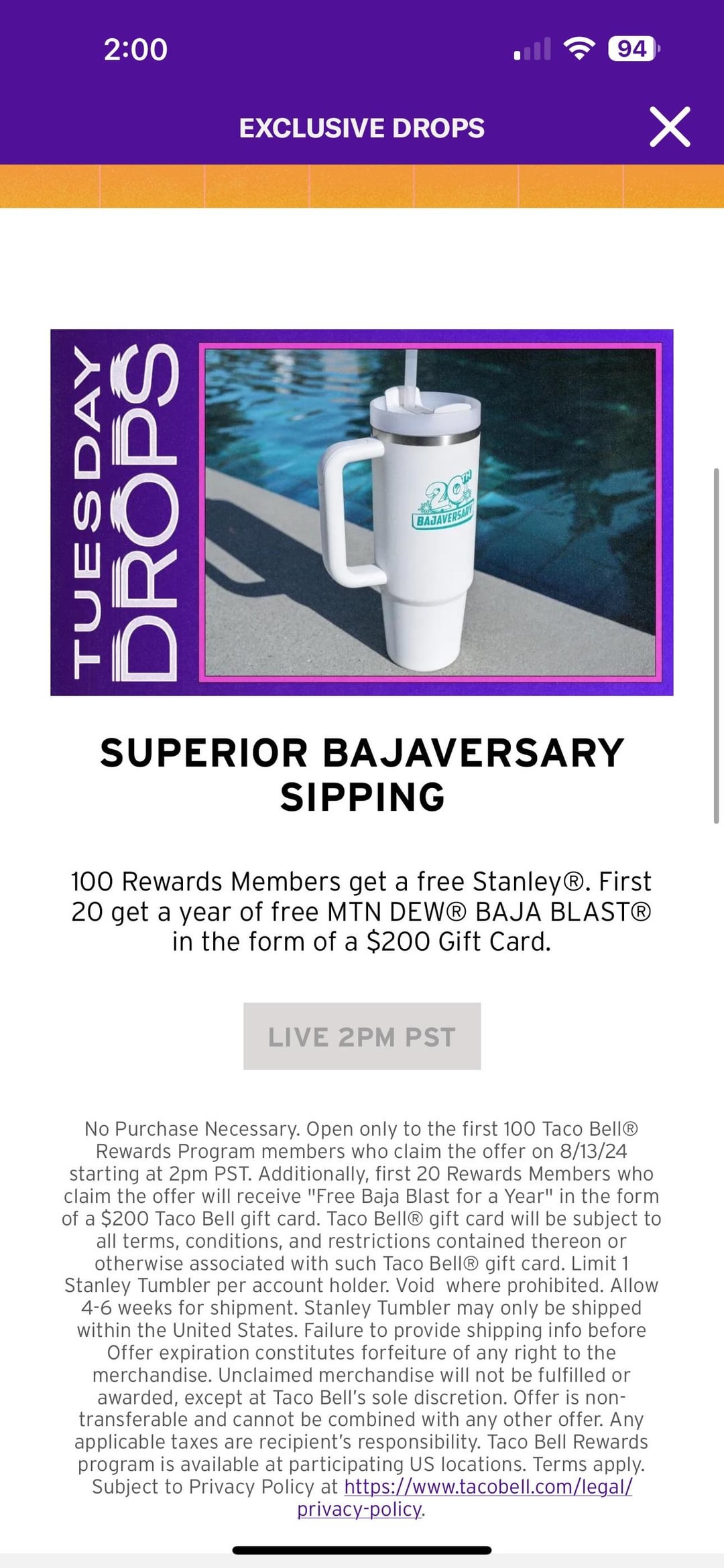 My failure to get the drop also. Didn’t even open until 2:01 pm here on the west coast. Really frustrated by a lot of things Taco Bell has been doing and this feels like some salt sprinkled in the wound.by Anogeissus taco bellWrite A CommentYou must be logged in to post a comment.