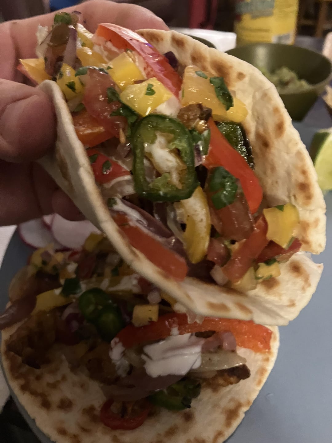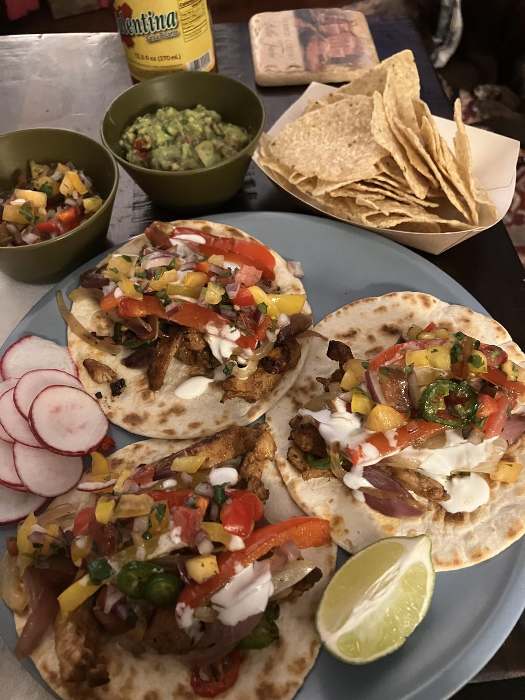 Chicken tacos with homegrown garden salsa and guacamole