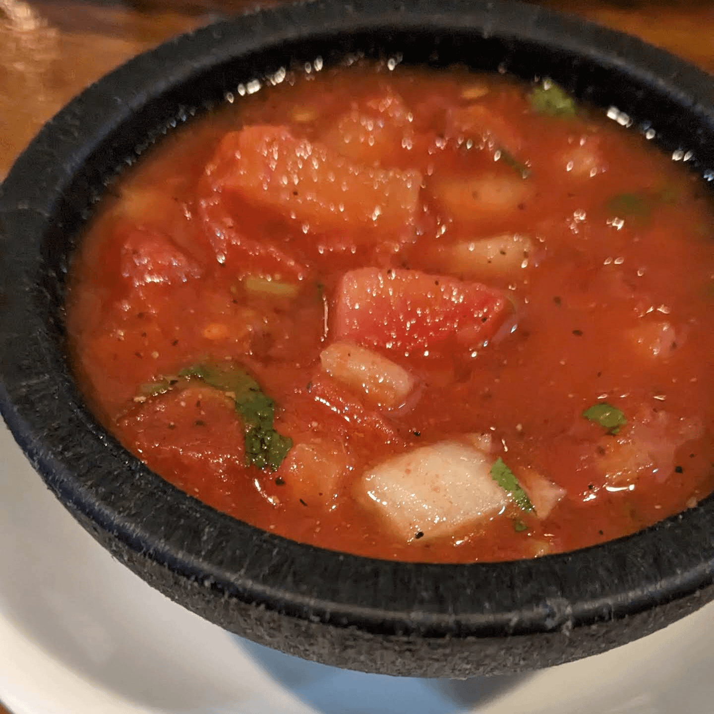 I won't apologize for absolutely loving this type of chunky yet watery salsa that a couple of Tex Mex restaurants around me serve. For the life of me I can't figure out how to make this and I can't find a recipe. It's definitely not all fresh ingredients but it's also not fully blended from a can. My best guess so far has been to make the typical blended canned tomatoes Tex mex salsa then also add in fresh chopped tomatoes and white onions, but then let it sit in the fridge to marinate for a while?