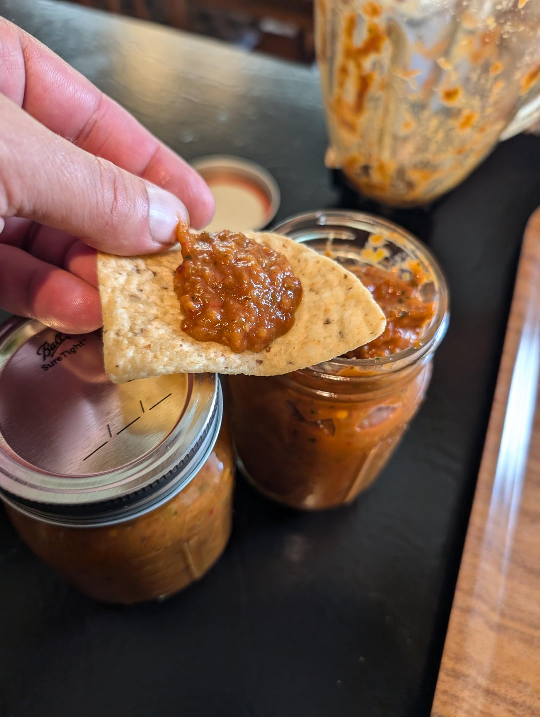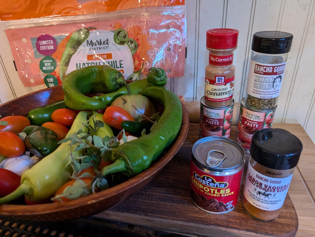 Tomato jalapeno banana pepper, garlic hatch chili peppers, Mexican oregano, chili powder, salt white wine vinegar, lime juice, cilantro, some canned Chipotle with sauce and half a can of tomato paste. Smoked at 300 on mesquite for about an hour. Spicy and delicious!