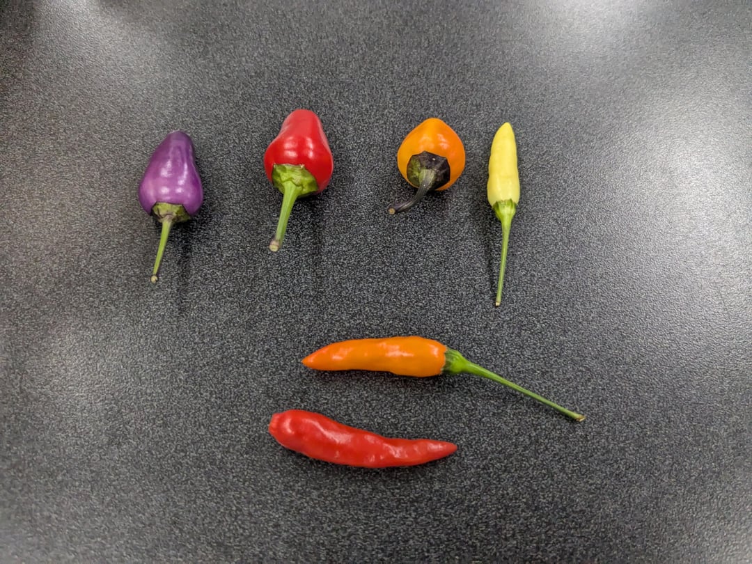 Someone brought a big bag of peppers into the office and we had some brave souls try some. I used Google lens and I think starting top left it is purple jalapeno, chili pepper, habanero, and Tabasco. I think the bottom two are also Tabasco? Someone in the office what I thought was the habanero and the Tabasco pepper and said that the Tabasco was hotter which doesn't line up with the scovile ratings. Are my assessments correct?