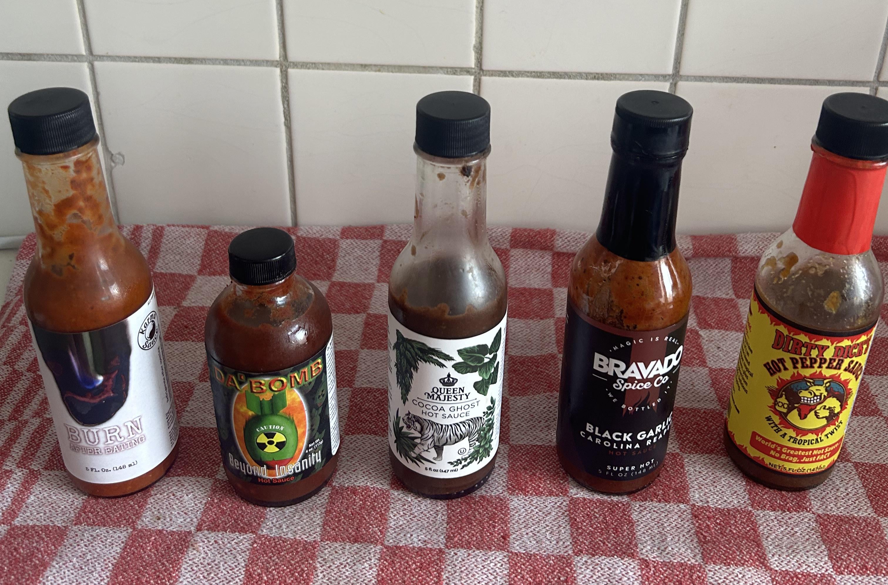 From left to right, Burn after eating, the bomb beyond insanity, Queen Majesty Cocoa Ghost Hot sauce, Bravado black garlic Carolina Reaper hot sauce, dirty dicks hot pepper sauce with a tropical twist.