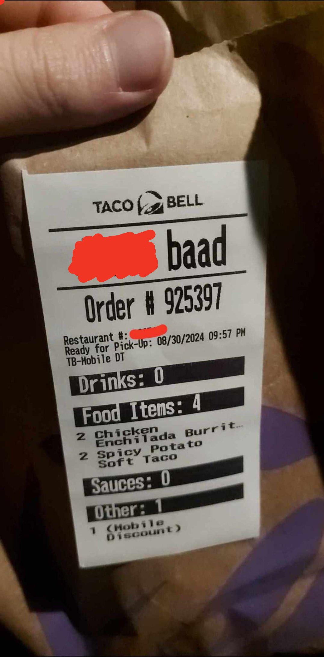 im fully prepared for this to be a very stupid post. i mobile order from taco bell every so often, but it's been awhile and I've never seen these labels before. 'baad' is not part of my account name. did they put that in there? are they mad at me?? should i be worried??? what is baad????