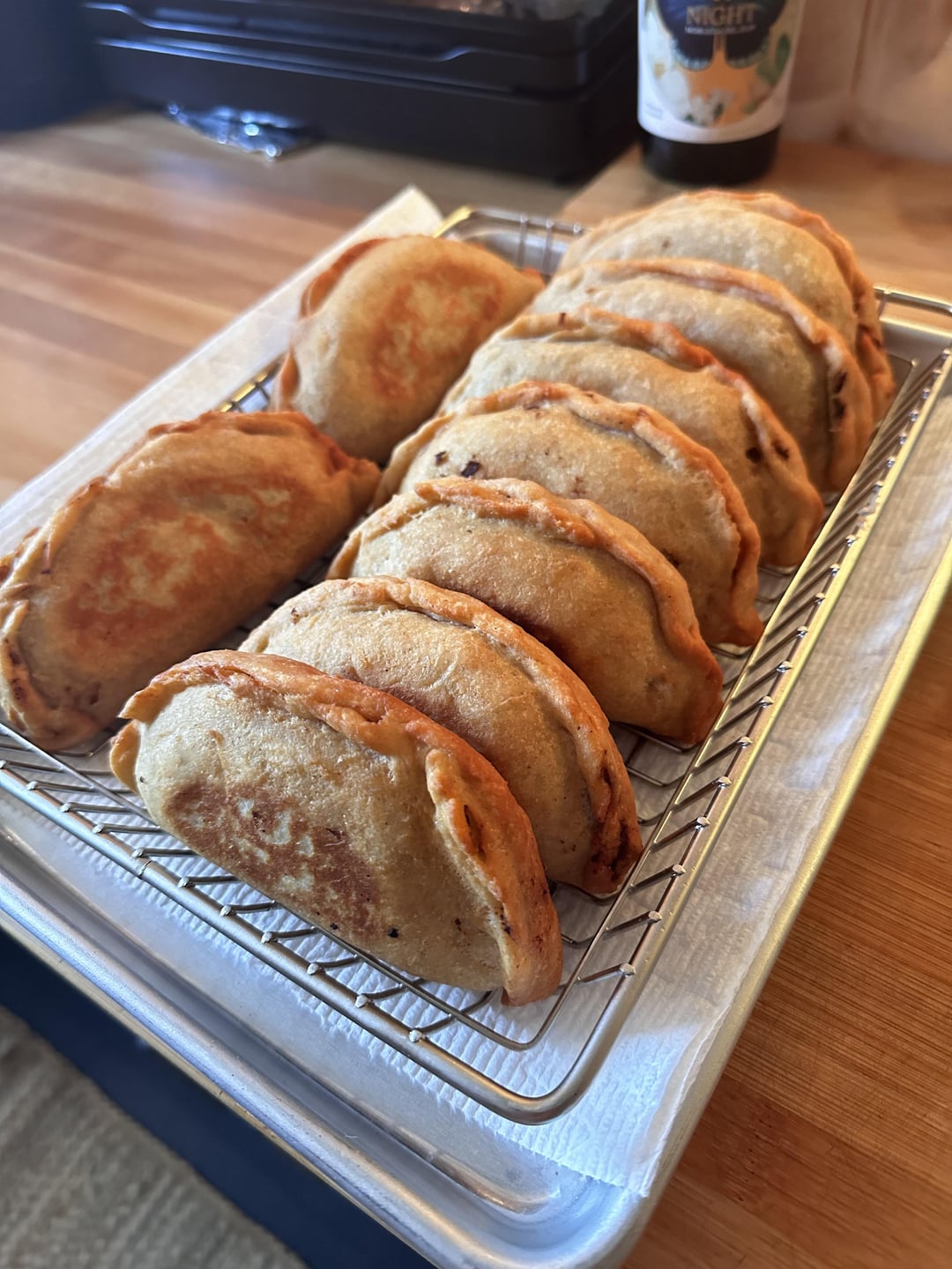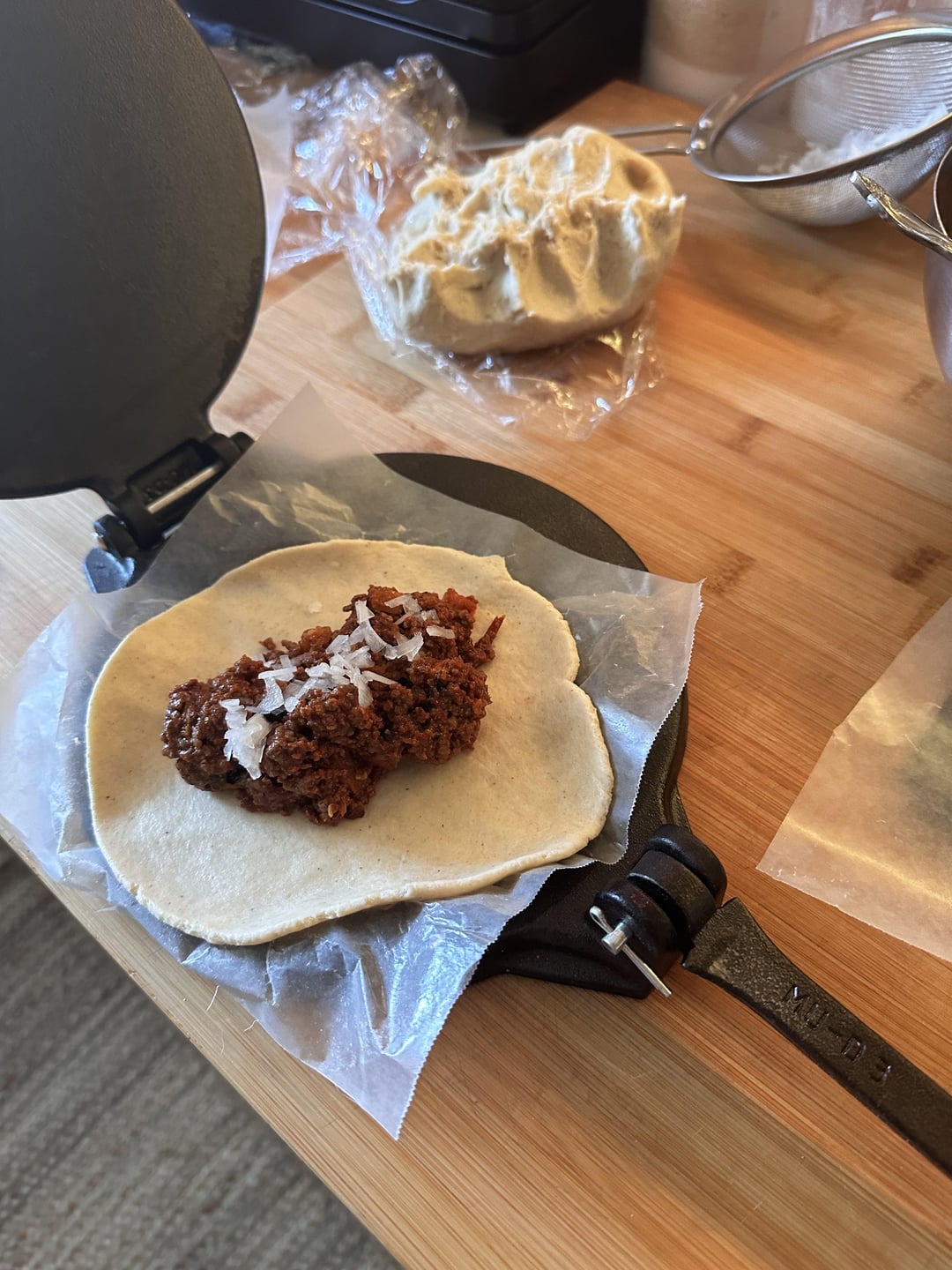 For the dough, I used bread flour, masa harina, butter, salt and water. (Refrigerated overnight). For the filling, seasoned beef and potato mixture with chipotle being the prominent flavor and topped with chopped onion. by TheLB1980 Write A CommentYou must be logged in to post a comment.