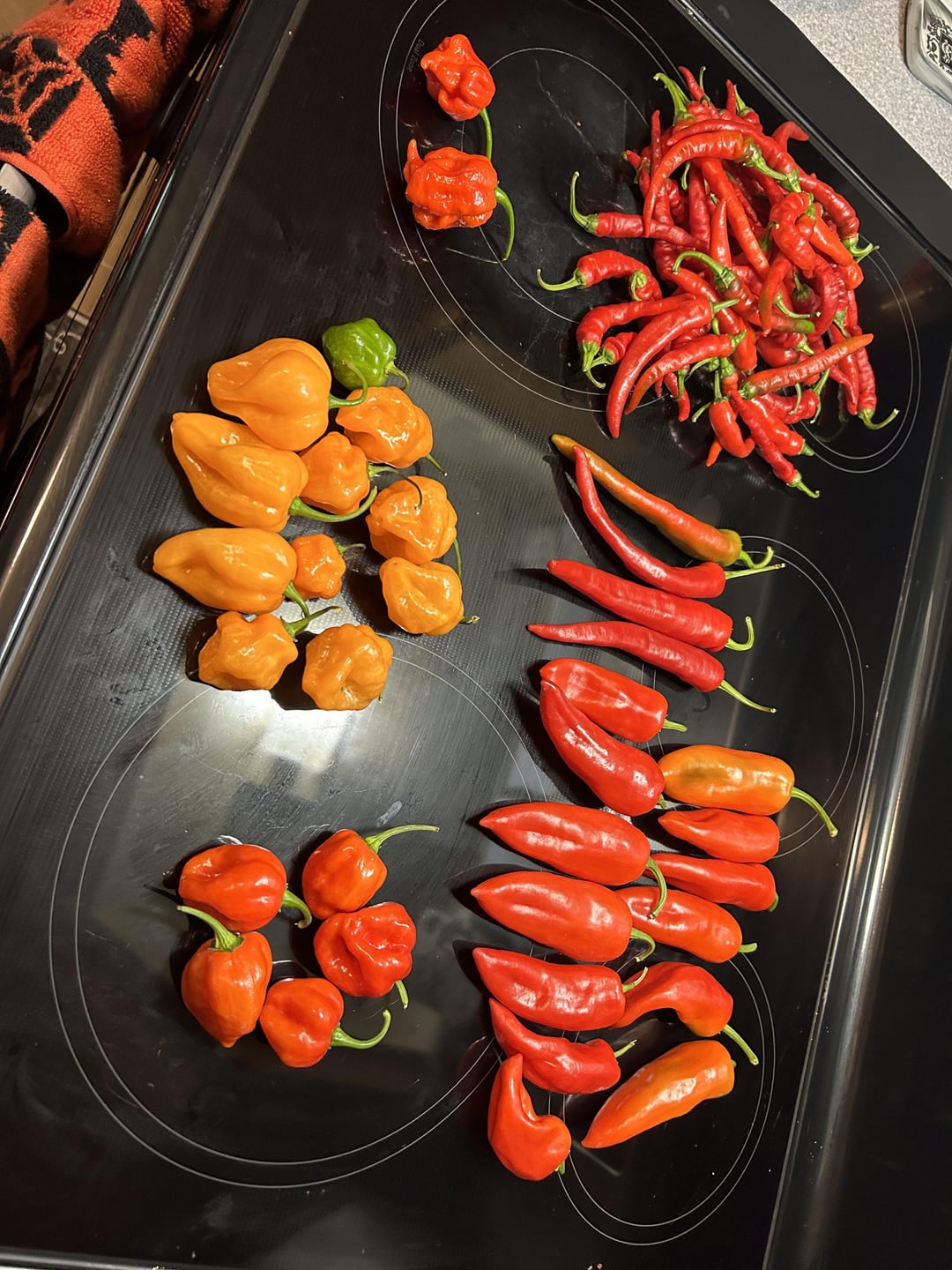 Many more to follow. Cayennes, long cayenne hybrid, red Serrano hybrid (not exactly sure but they were from seeds of Serranos I grew last year), scorpion (Trinidad moruga), orange habanero, red habanero (possibly red savina) by boopsl Hot peppersPeppersSpicy Stuffsweet peppersWrite A CommentYou must be logged in to post a comment.