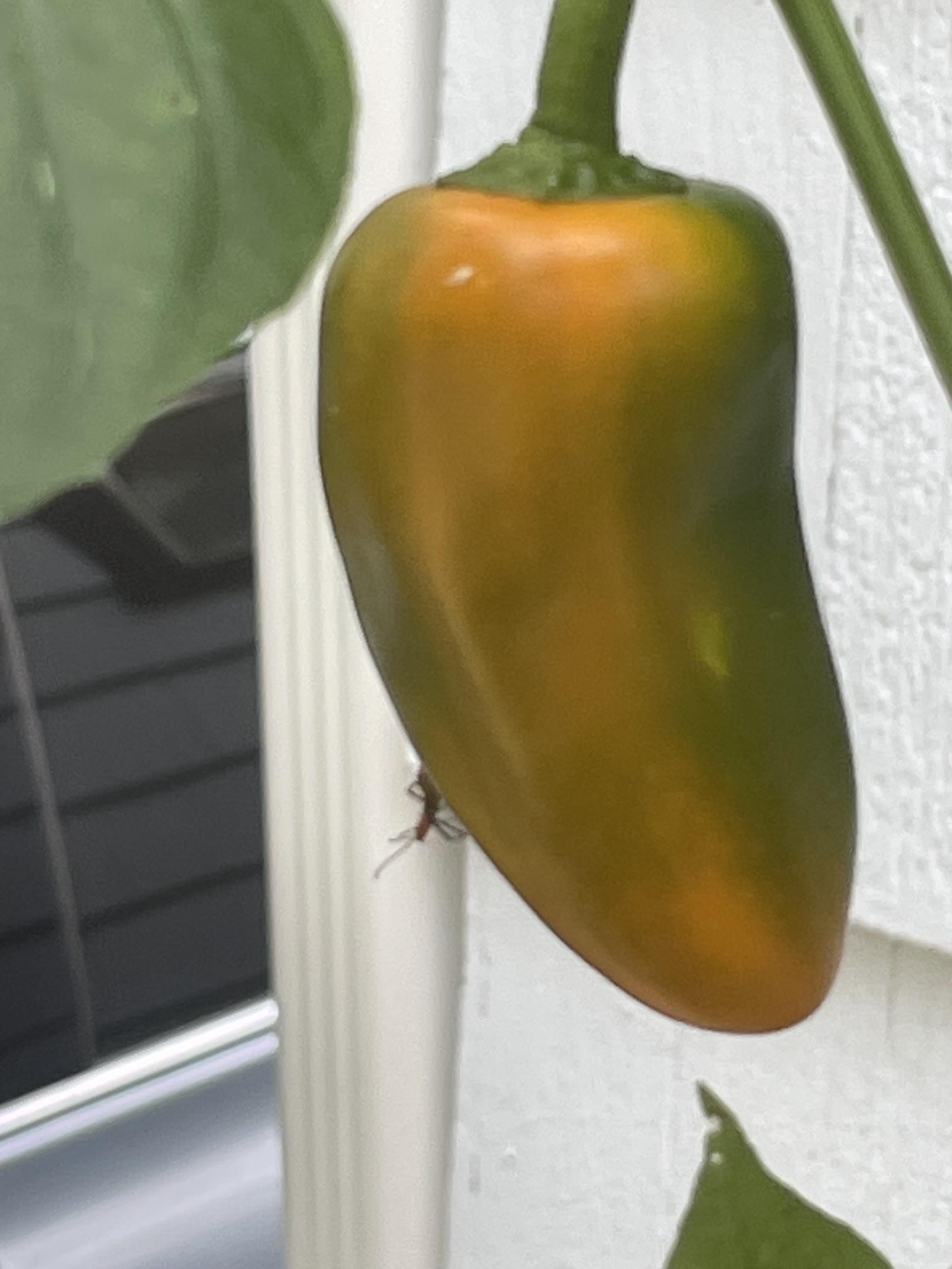 Seeds came from one of last year’s sweet bell peppers, but obviously that’s not what these are. Shape suggests it may have crossed with my giant jalapeno, but theoretically it could be a ghost or Hungarian wax/pepperjoe pepper, those were grown nearby, or something a neighbor planted. So close to ripe!