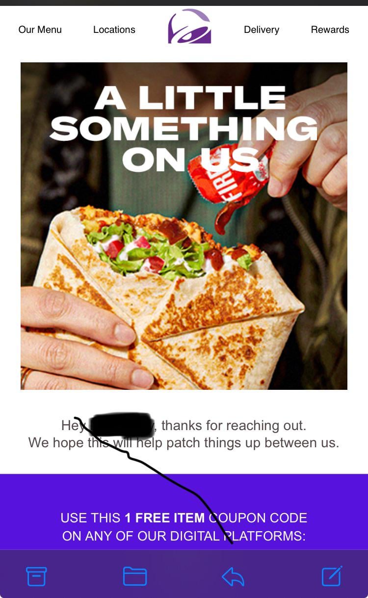 Randomly got this after the drop didn’t work. by jeeves585 taco bell 2 Comments Nani_Alize 1 year ago Did you report it to support? Cuz that’s how you usually would get that coupon. I get it when I report something wrong with my order Low_Egg_561 1 year ago The email said item valued at $10. In reality it only took $5 off.Write A CommentYou must be logged in to post a comment.