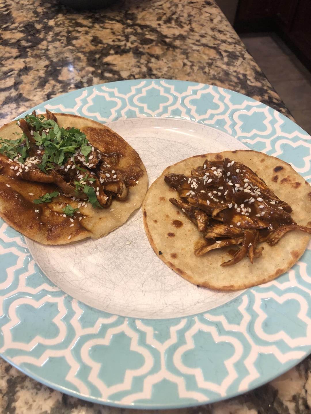Chicken tacos with mole and cilantro. Little bit of contigo habanero hotsauce. Delicious.