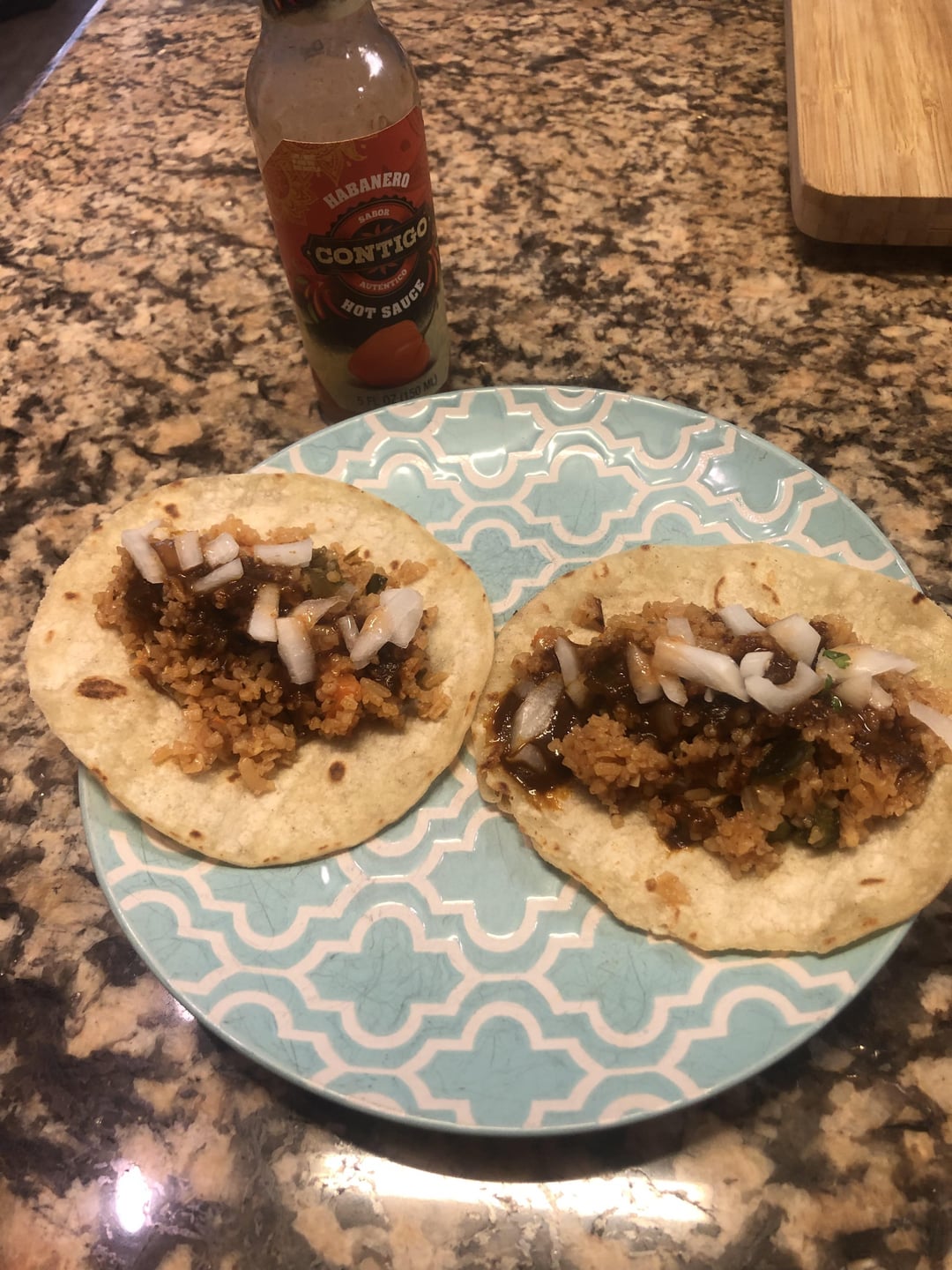 Mexican rice tacos with mole and white onions.