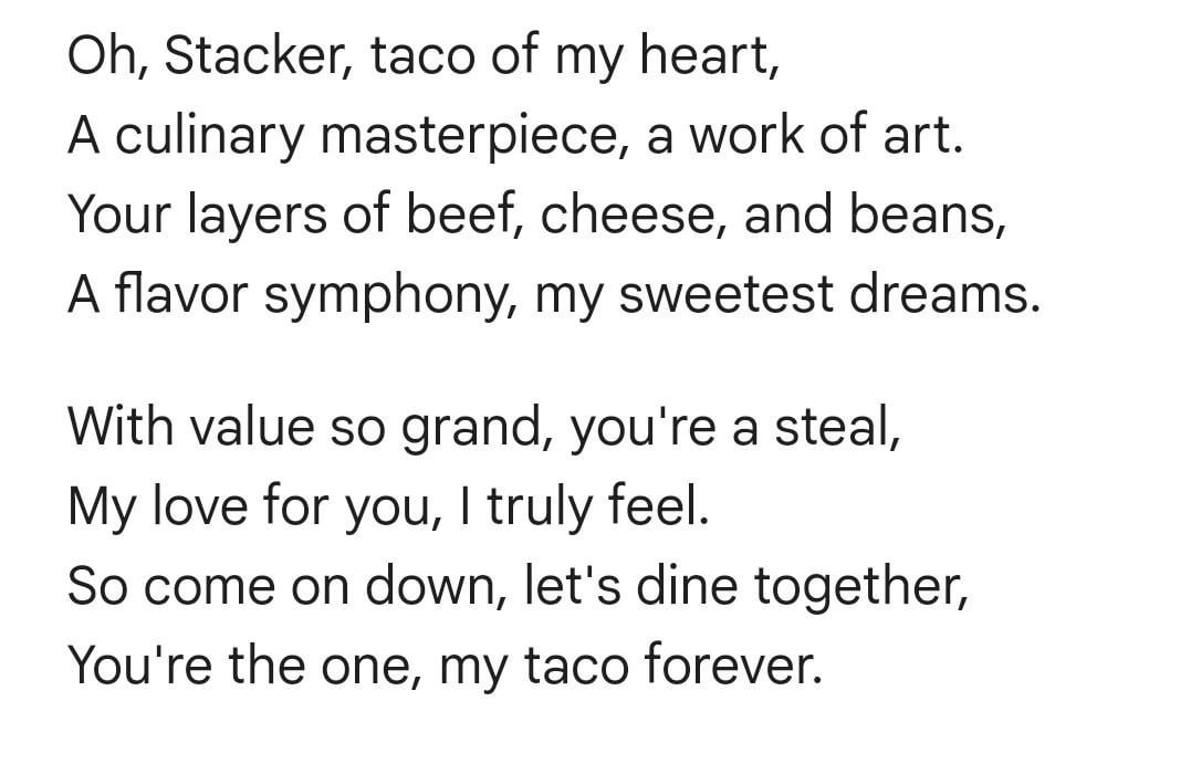 A Stacker Serenade by cheekychestercopper taco bellWrite A CommentYou must be logged in to post a comment.