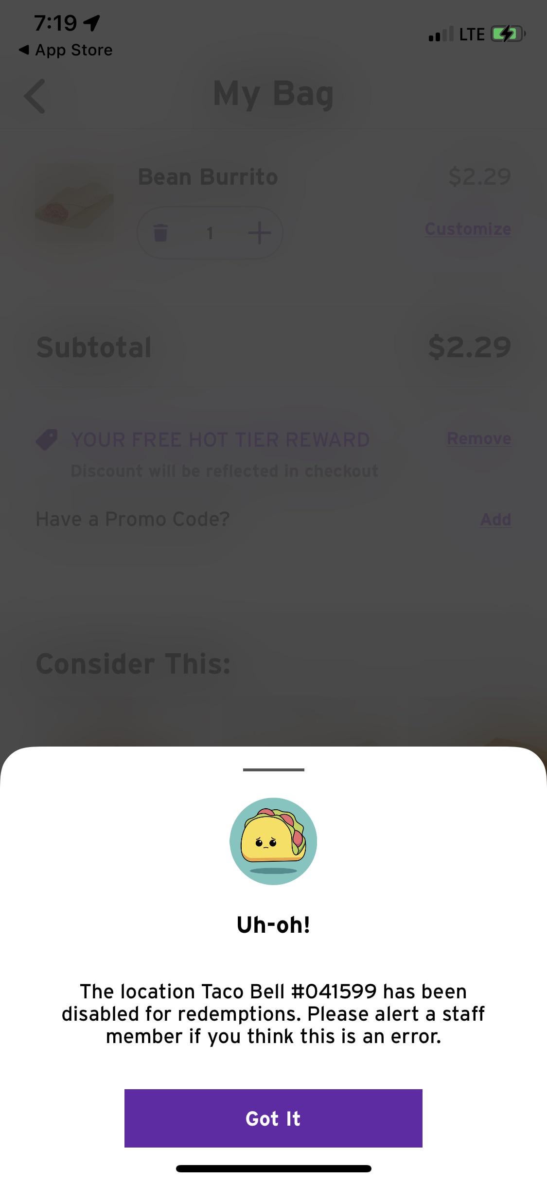 For some reason every time I try to order I get this error message. I’ve tried at 2 different locations. What do I do?