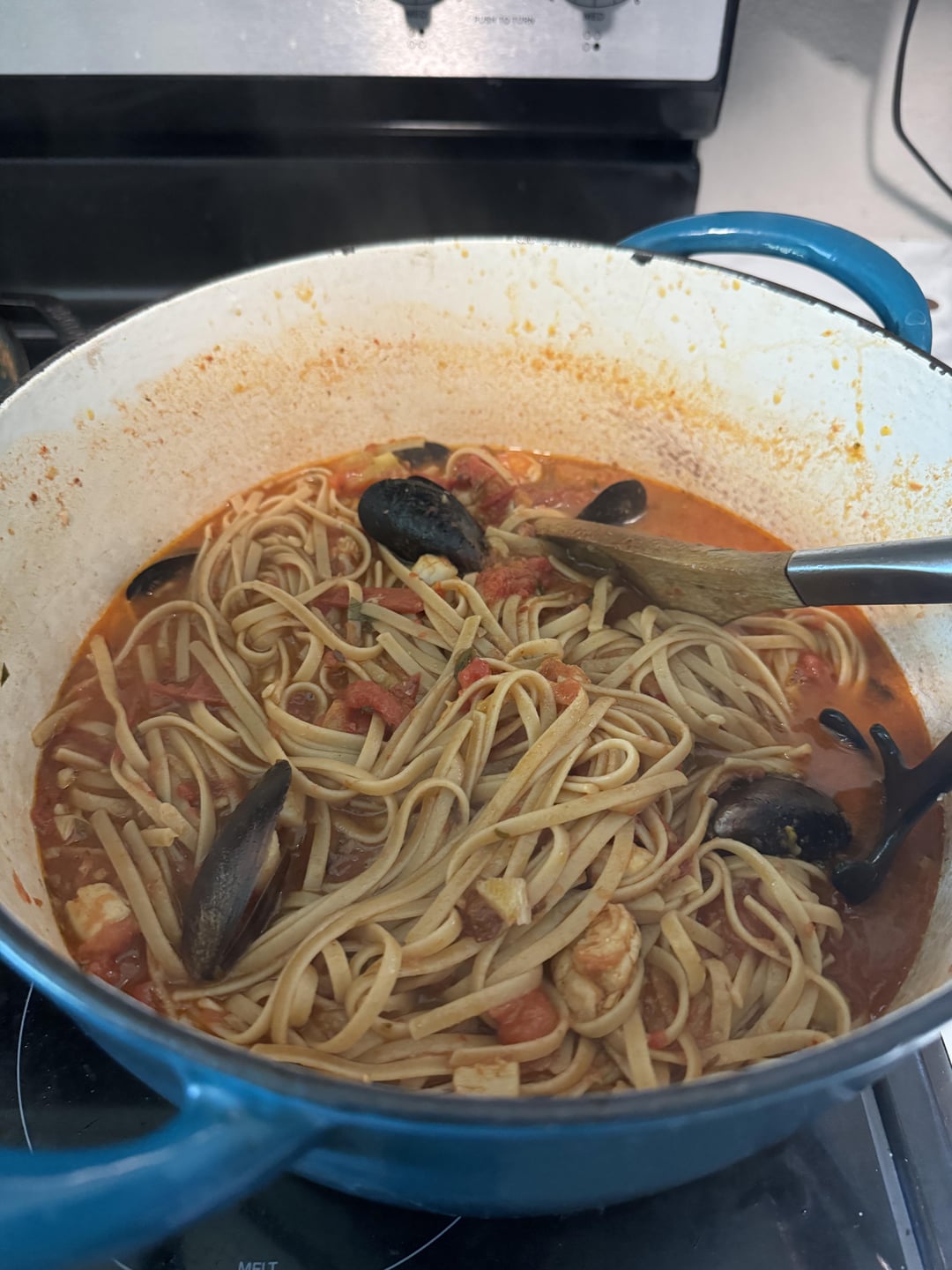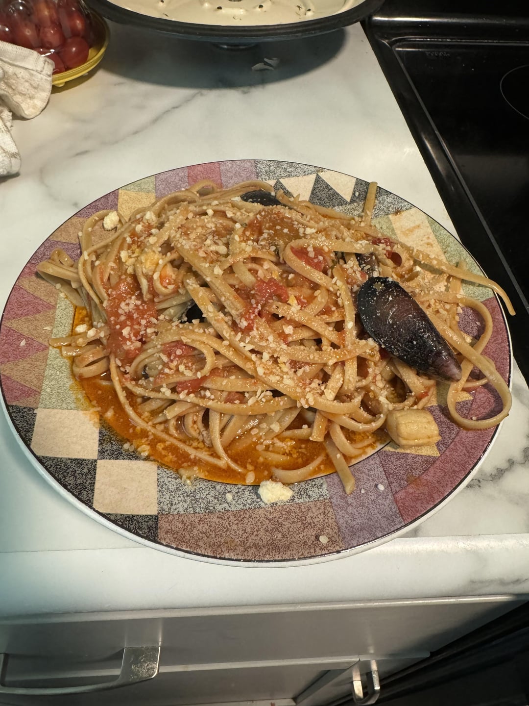 Scallops, mussels, and shrimp. Linguine for the pasta. Fresh tomatoes, olive oil, garlic, anchovies, oregano, and basil for the sauce.