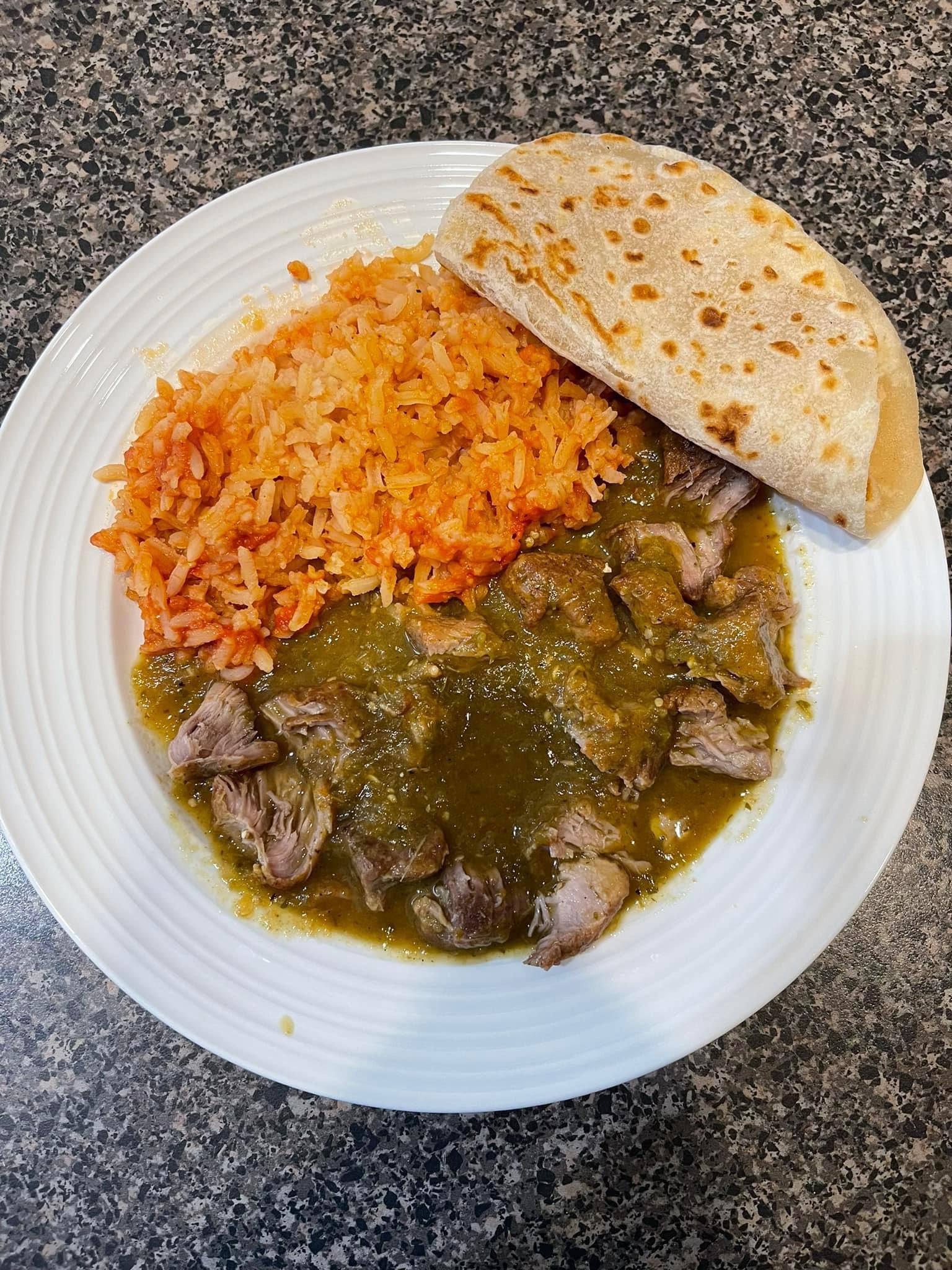 So many people on here giving you shit for the “Spanish” rice lmao, who cares they got what you meant. It looks delicious! I love Chile verde!