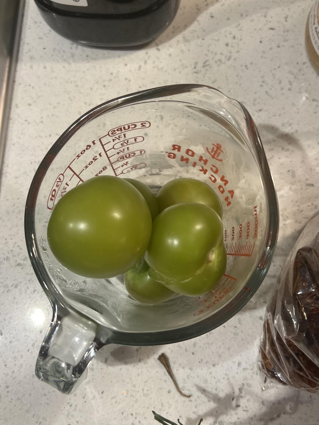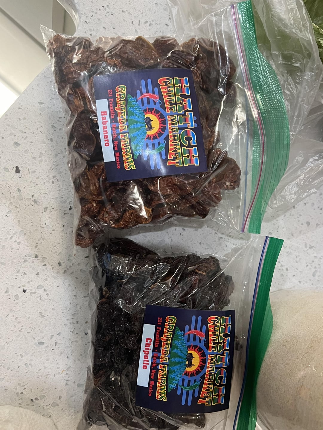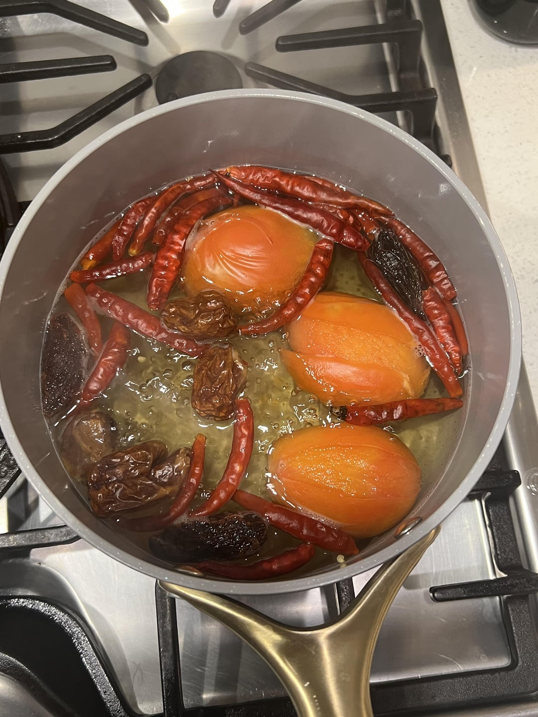 3 tomatoes, 4 tomatillos, 4 dried habaneros, 3 dried chipotle, 12 chile de árbol, 2 roasted garlic cloves, a little cilantro.