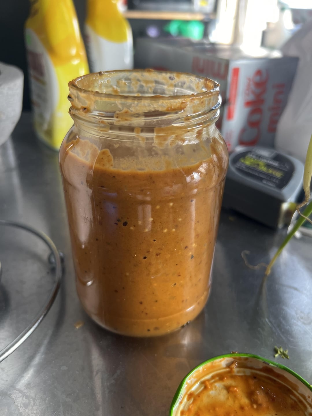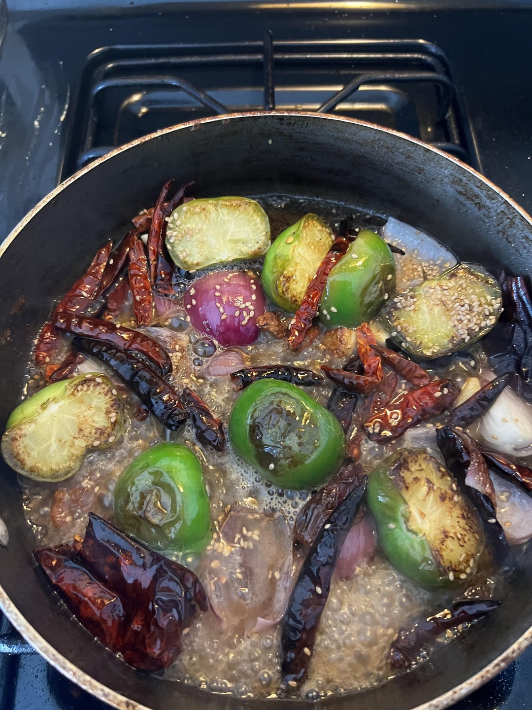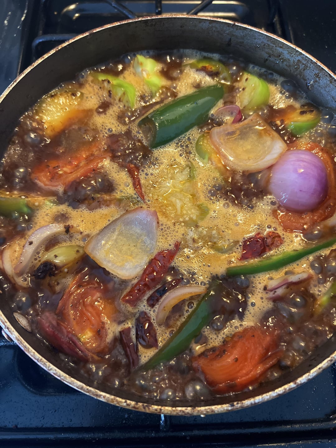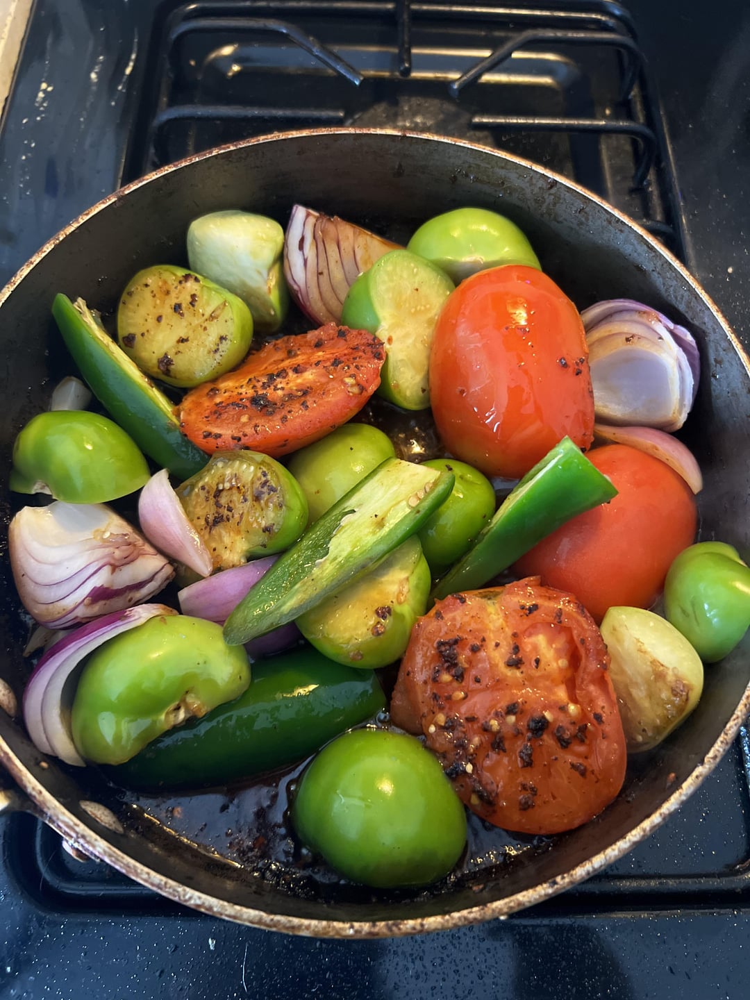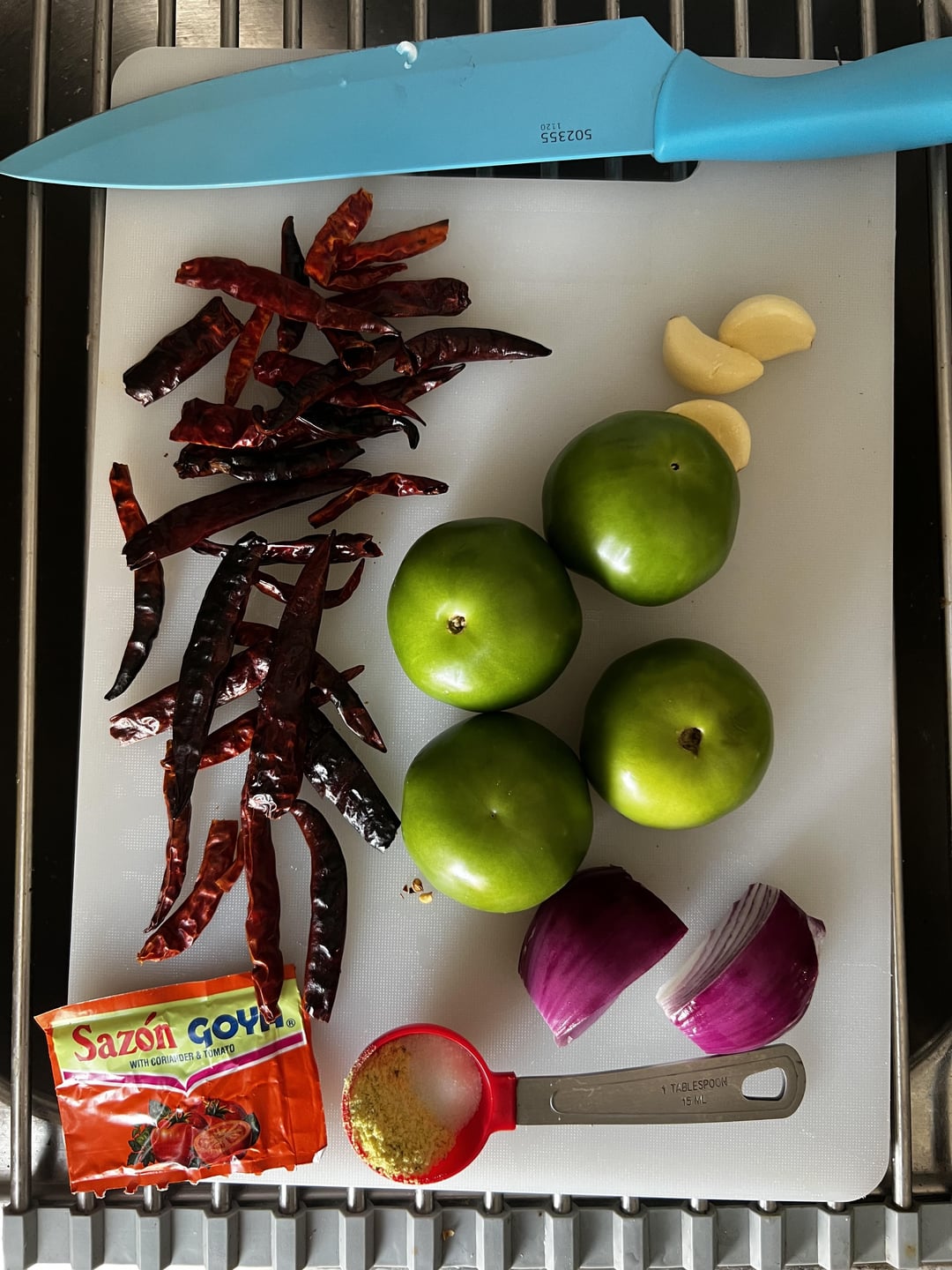 I charred the tomatillos, pork fat and onion in vegetable oil. Then I introduced the garlic, let it brown, and toasted the chiles a bit. Toasted the sesame seeds. Added the beer, cooked veggies down further. Added all ingredients to the blender, including the salt, buillon, sazon, 1 cup of water and ginger.