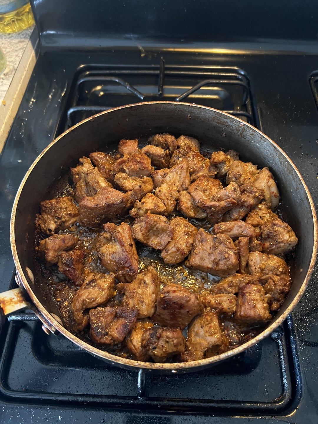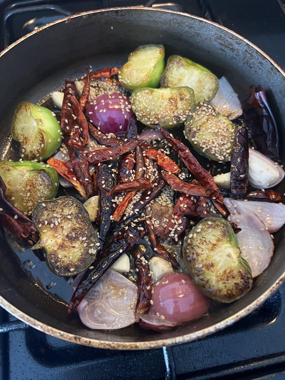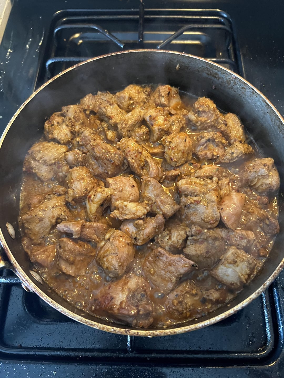 In the same pan, I cooked some pork in a separate sauce (that I didn’t document properly). I left all of the crispy bits in the pan, added more oil and introduced the following:
