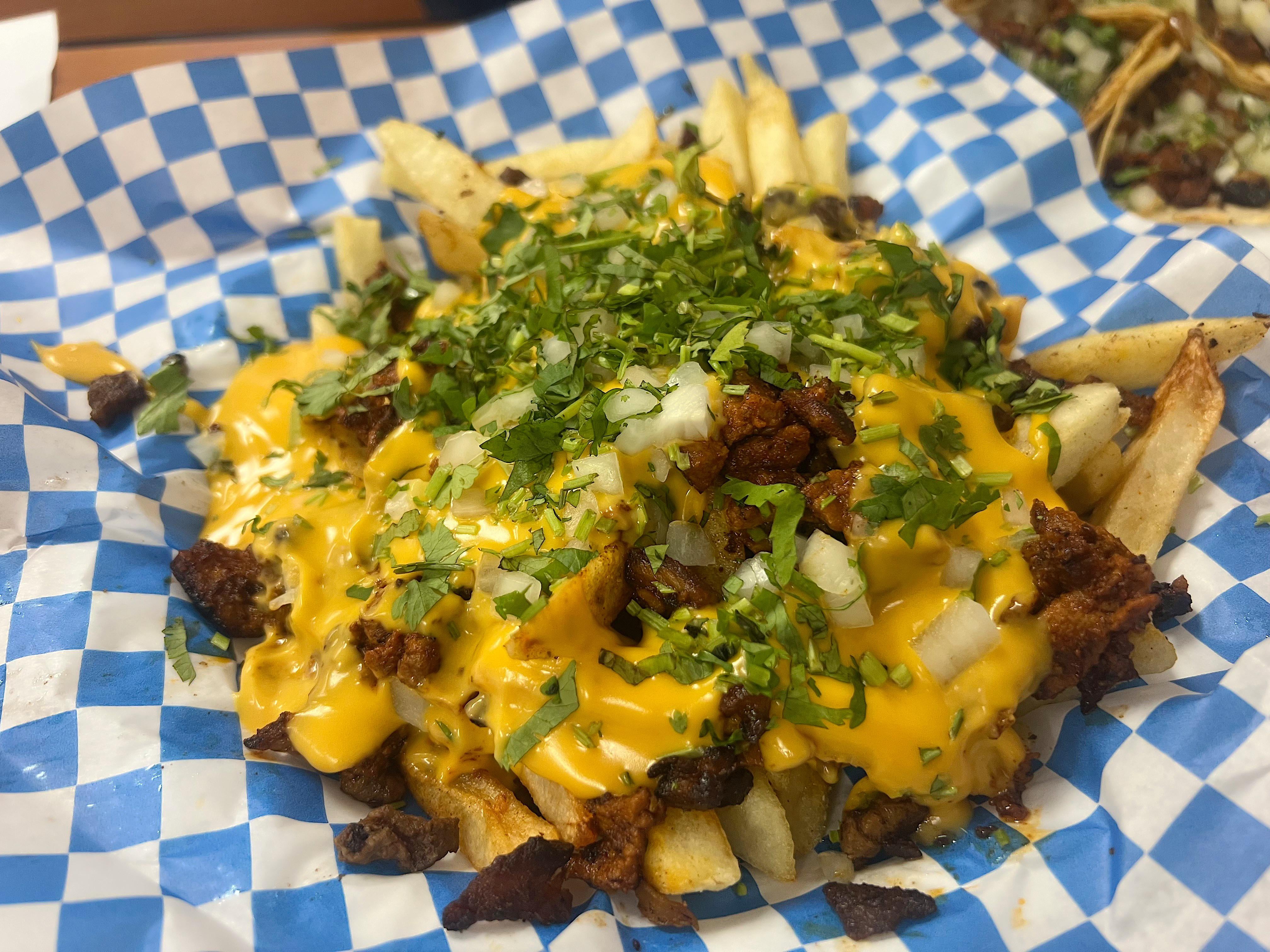 Nacho cheese pastor fries