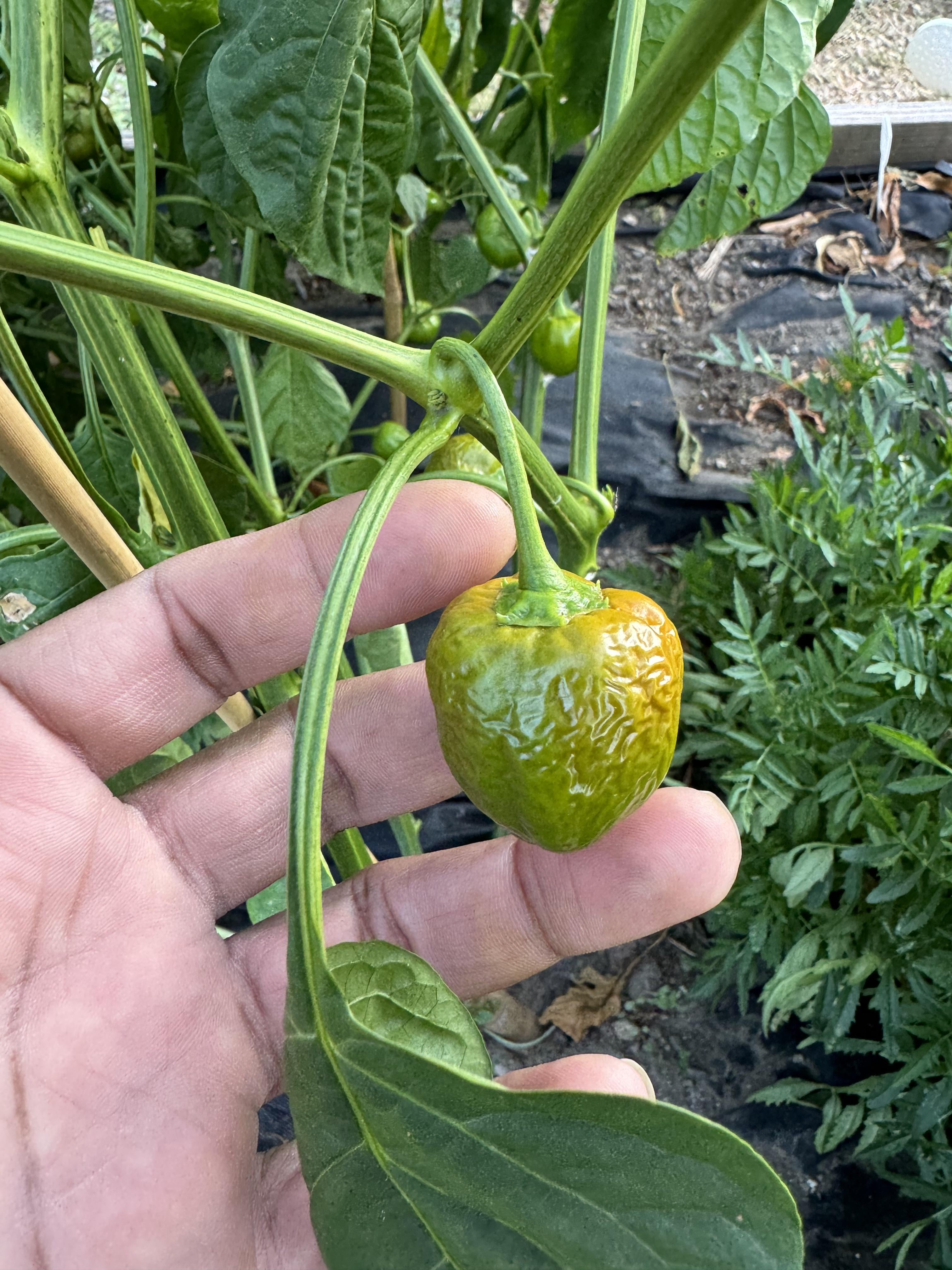 This Peppadew/Malawi Piquant plant in my garden was one I started from seed so it was the slowest to grow but caught up to the other 2 seedlings I got at a farmers market. With that said, it’s finally starting to ripen and some of the fruits look like this. Any ideas? There’s plenty of water in the soil and it’s gotten nutrients during the season. The other surrounding plants don’t show any signs of pest damage either.