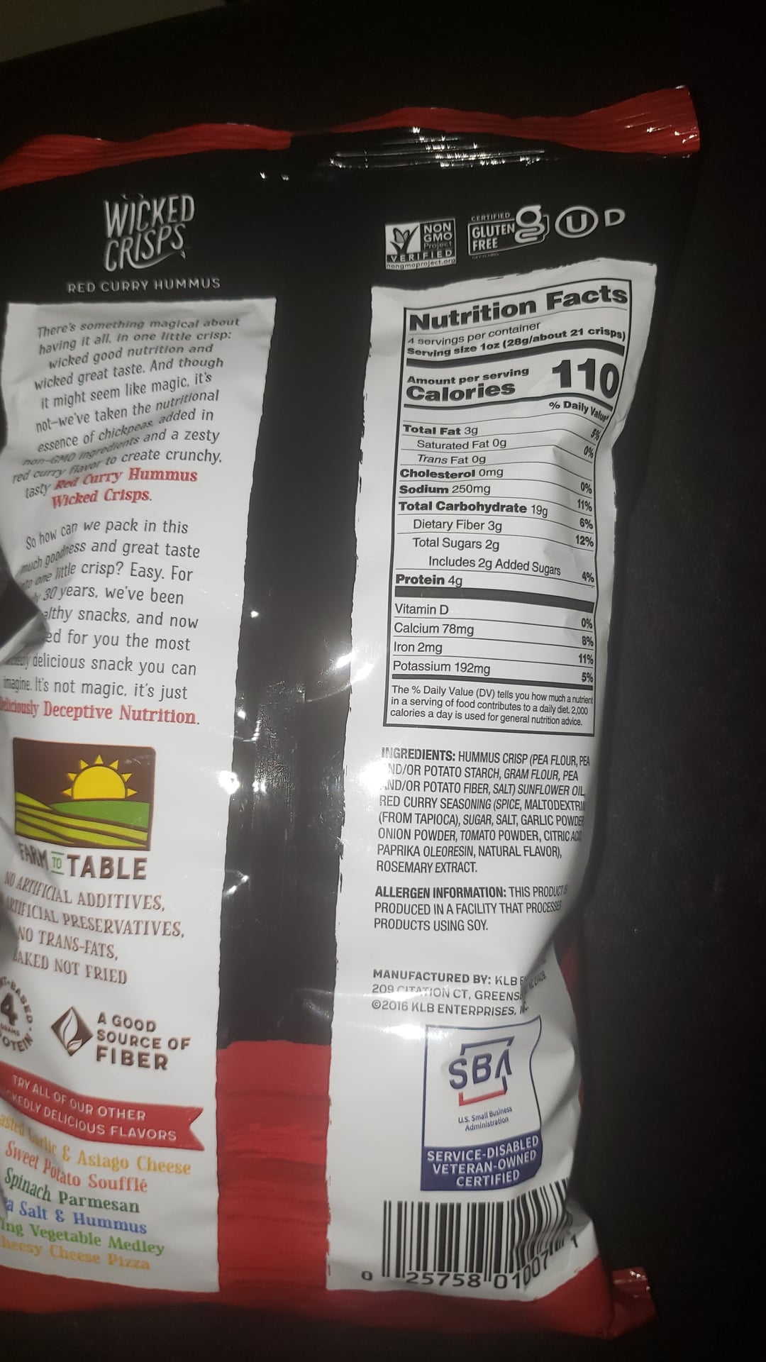 Strong curry flavor lower end on the spice and 21 of these big crisps are only 110 calories (1 serving) which is 440 for the whole bag if this where a bag of doritos same size it would easily be over 1100 calories only downsize is even though the serving size is massive and the calories are nothing you gotta tell yourself to stop (And that's coming from someone whose lost 136 pounds in a little over a year and a half through portion and self control alone) sometimes they can survive the day others i open the bag and blink they're gone and on top of that they're actually healthy! think I found my favorite snack