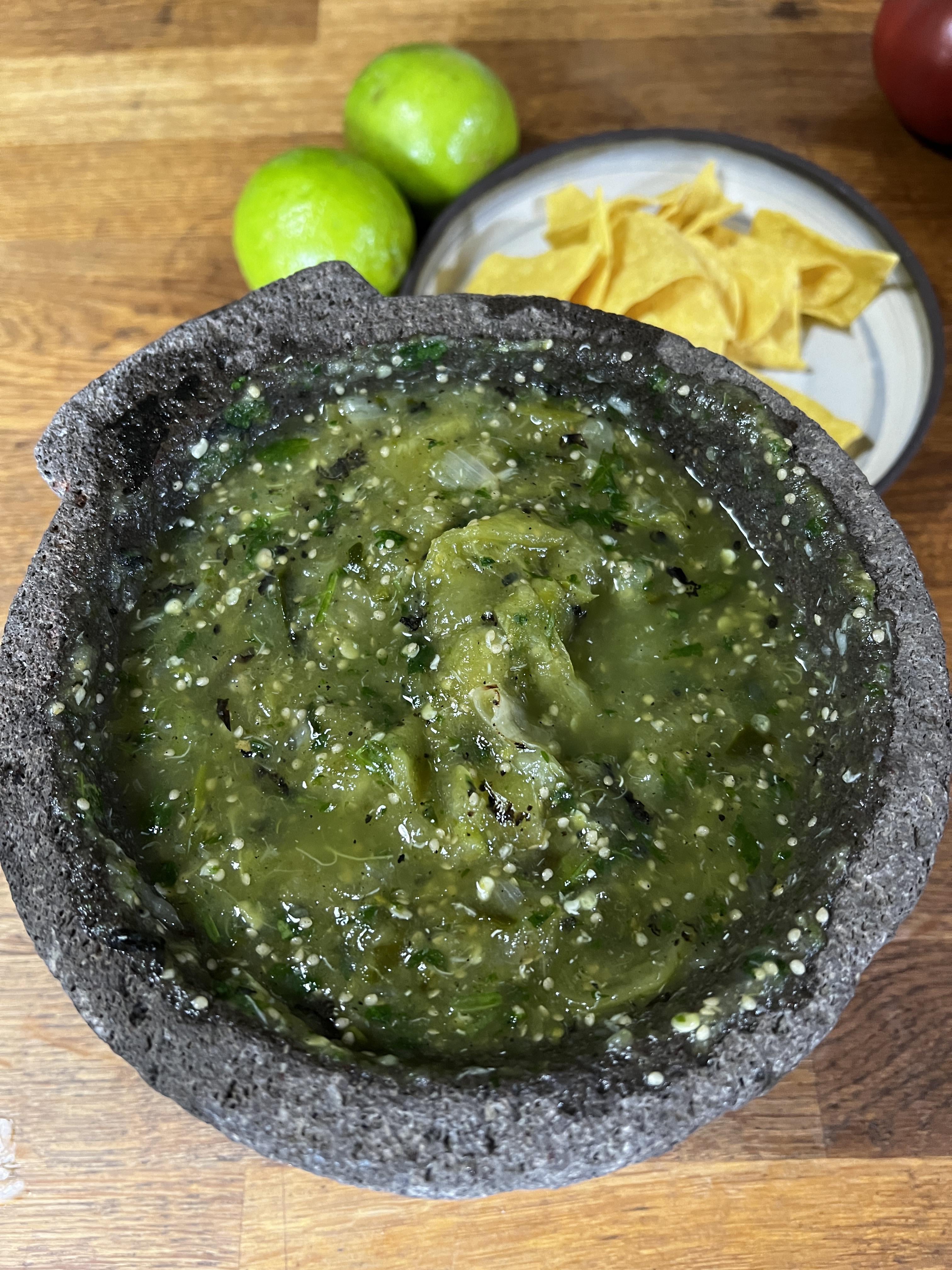Oven roast tomatillos, garlic, serranos, poblano, onion until slightly charred.