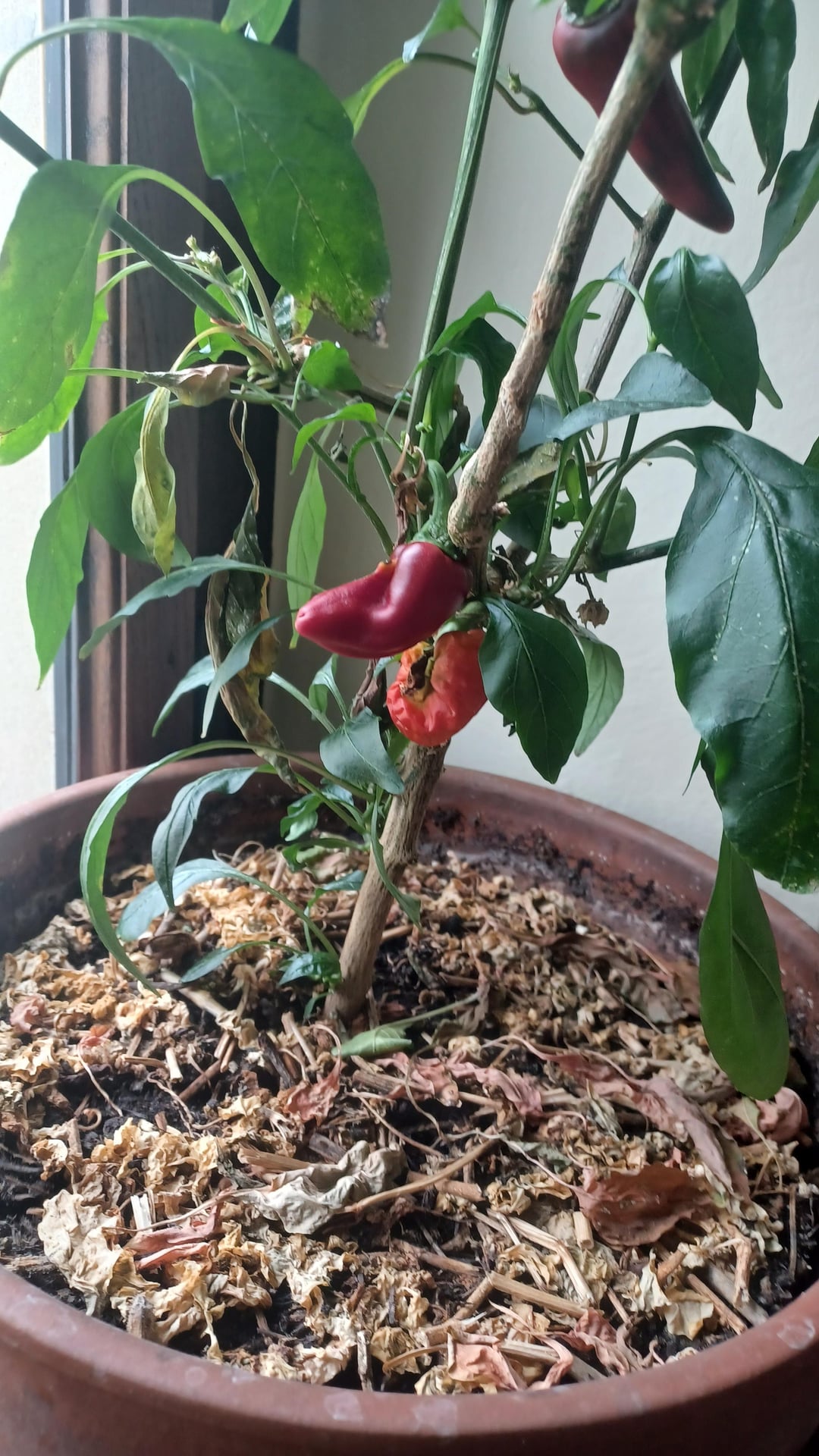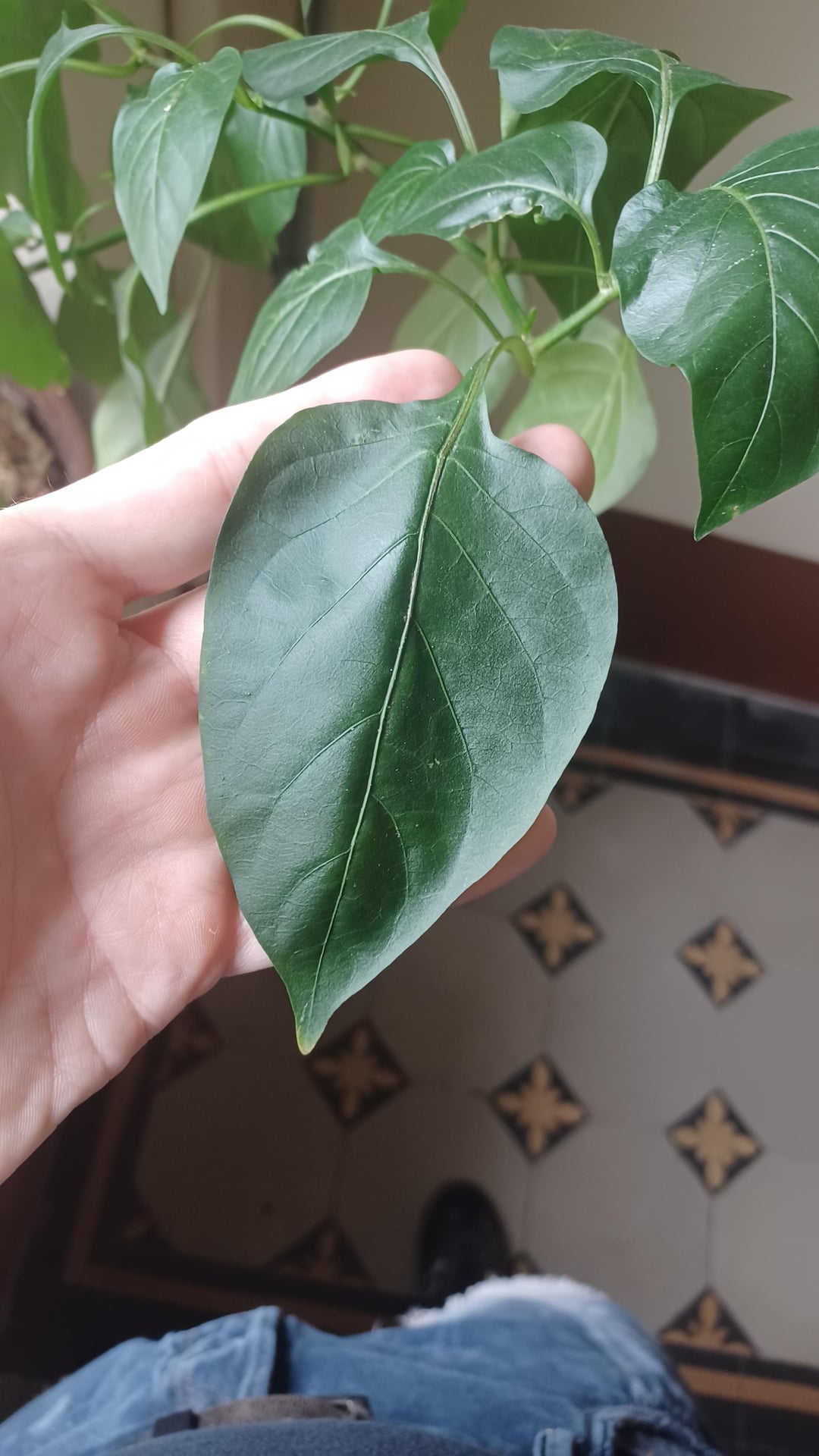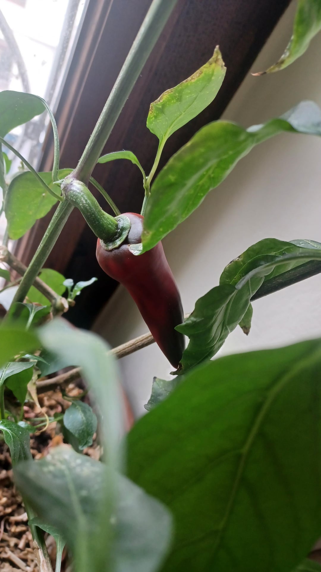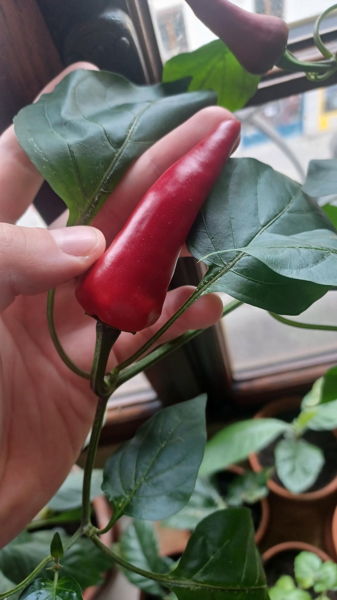 I hope these photos are detailed enough. This chili just looks so mundane, I can't seemingly find any exact fit. This chilli was growing at a friend's workplace, he brought it over once when we were eating dinner together and I decided to take the seeds and plant them. It's relatively hot. The chillis in the photo were growing in somewhat warm conditions and wound up being pretty spicy. They ripen green to red, moderately sized, with the pod flaring out from where the stem ends as opposed to forming a more straight line from stem to pod, like a Cayenne would. I had suspected it might be an Espelette Pepper, but I'm not so sure. When telling my friend he insisted it wasn't an Espelette, but he didn't tell me what he thinks it was, soaybe he was just teasing me. Also, my dad's wife is growing peppers and she has an Espelette pepper, and honestly, the leaves of her plant felt noticably thicker, while mine feel quite thin in comparison, similar to other breeds she had in her garden.