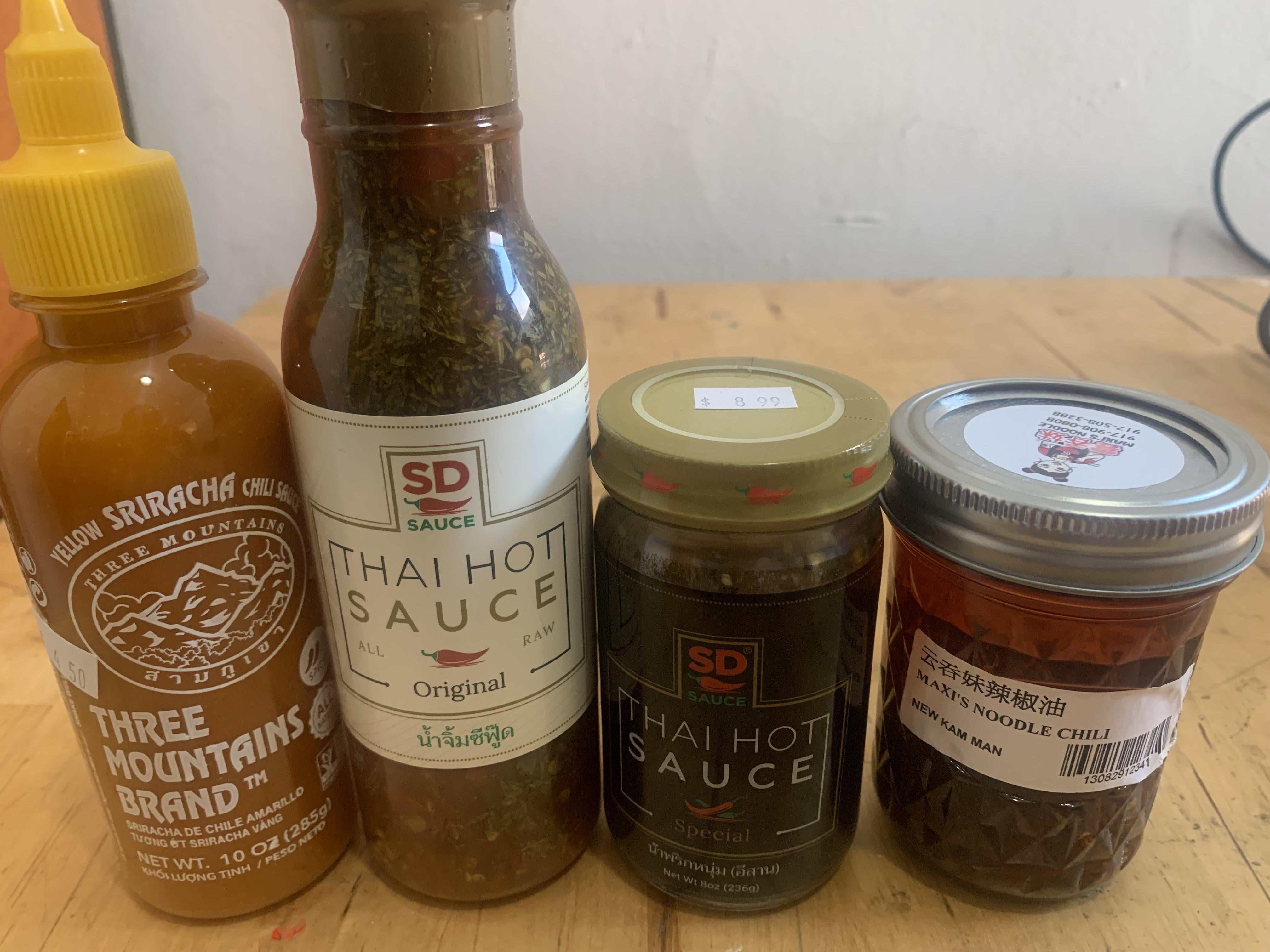 I stopped by NYC’s Bangkok Center Grocery and Kam Man foods to pick up a few things and added these to my cart. Maxi’s Noodle is a HK-style noodle shop in Flushing that sells their excellent chili oil at Kam Man. I went through my last jar of it really quickly. The other 3 are all from the Thai market. I haven’t had that brand of Sriracha yet but the SD original sauce is one of my favorite things to put on fish, and I’m pretty excited for the jarred sauce, which the shop owner said is more of a chili paste.