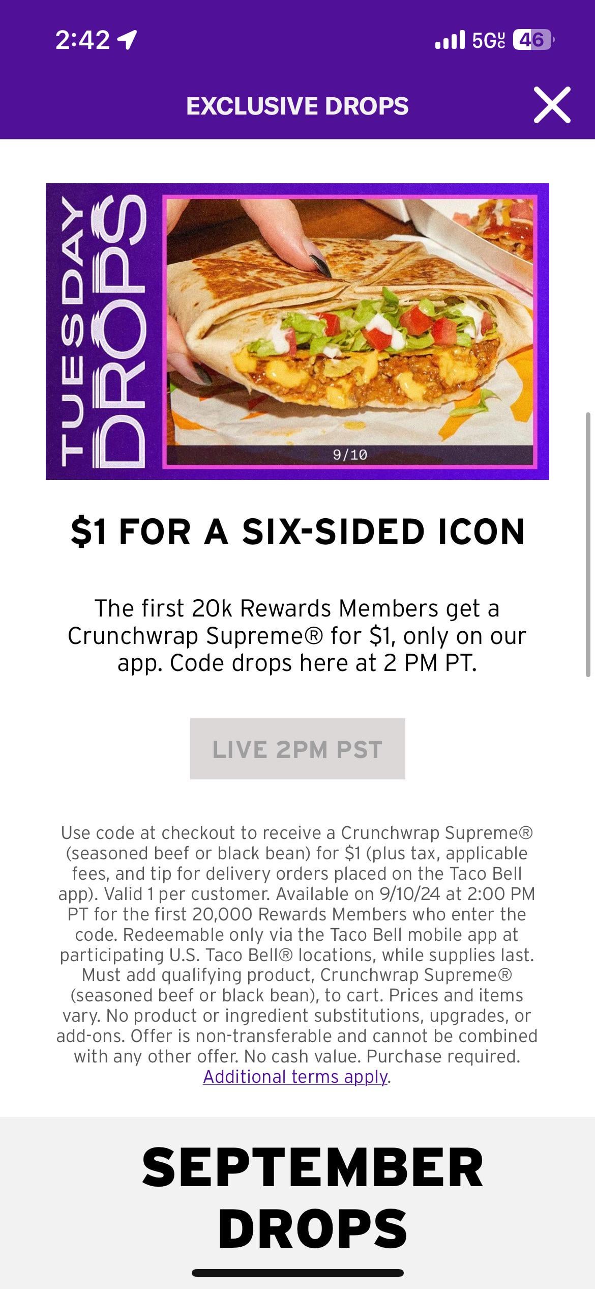 Hi guys! I’ve been at Taco Bell since 1:50pm, because I’ve been attempting to get a $1 Crunchwrap. It says it drops at 2pm today, and currently it’s 2:45pm, and I’ve been sitting on the app trying to use this and it’s been grey the entire time. I do not know how to get it to work sadly. I attempted to just add a Crunchwrap and check out and hopefully the price would drop to $1 but that didn’t work. I asked the people inside Taco Bell and they said there’s nothing they can do on their end to discount it to $1 since I’d have to order it on my phone and they don’t know why the discount code is.