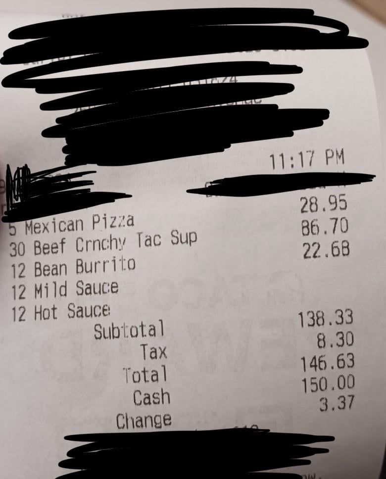 Damn, now I feel better about ordering Taco Bell when I was high earlier, my order was nowhere near as bad as this