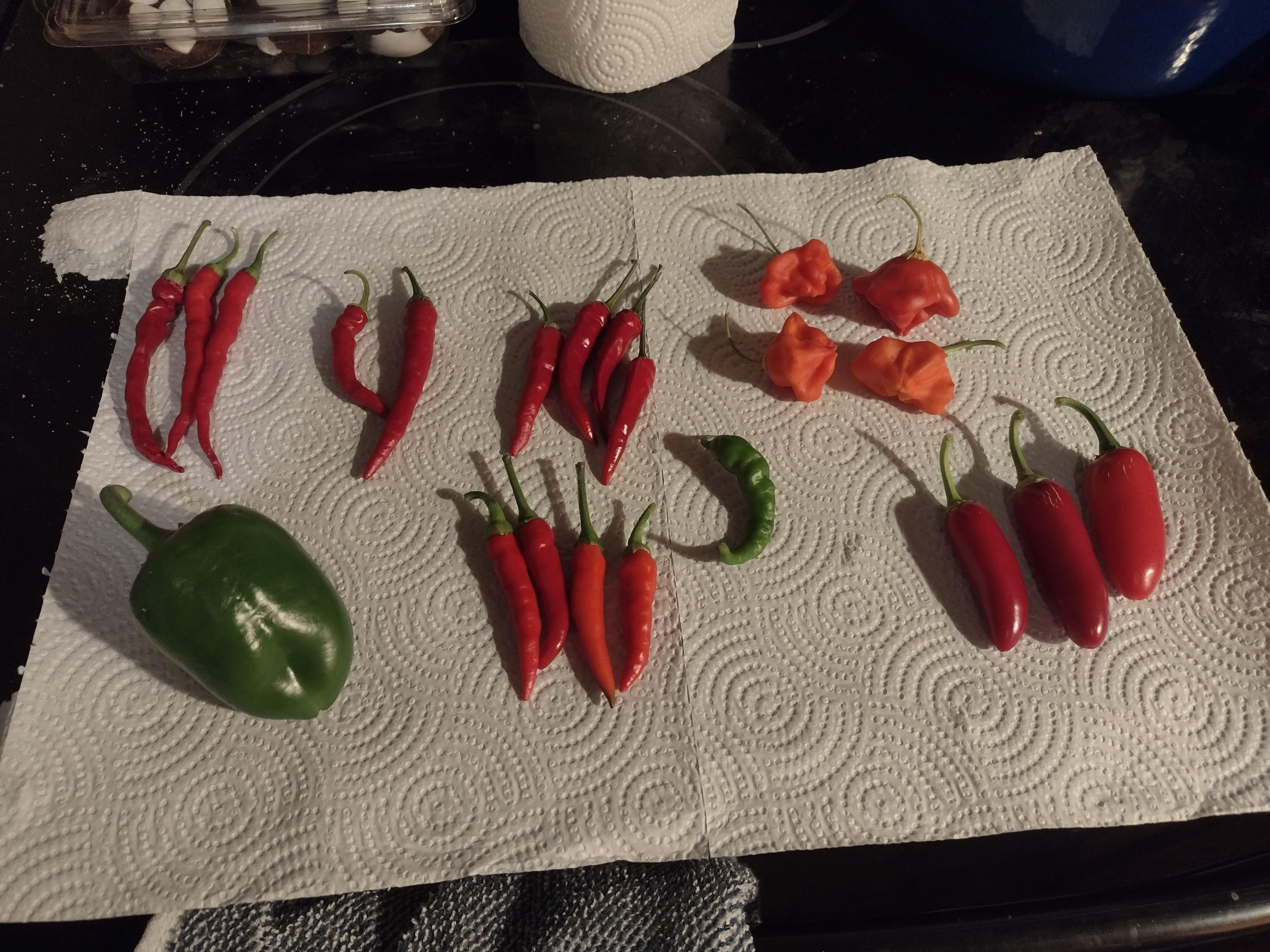 From left to right top by row: Ring o Fire, Dragon Cayenne, Thai chili mix of some sort, Uba Tuba, underdeveloped bell pepper my dog knocked off the plant, Black Cobra, some green cayenne(?) and Jalapenosby TheSpookyGoost Hot peppersPeppersSpicy Stuffsweet peppersWrite A CommentYou must be logged in to post a comment.