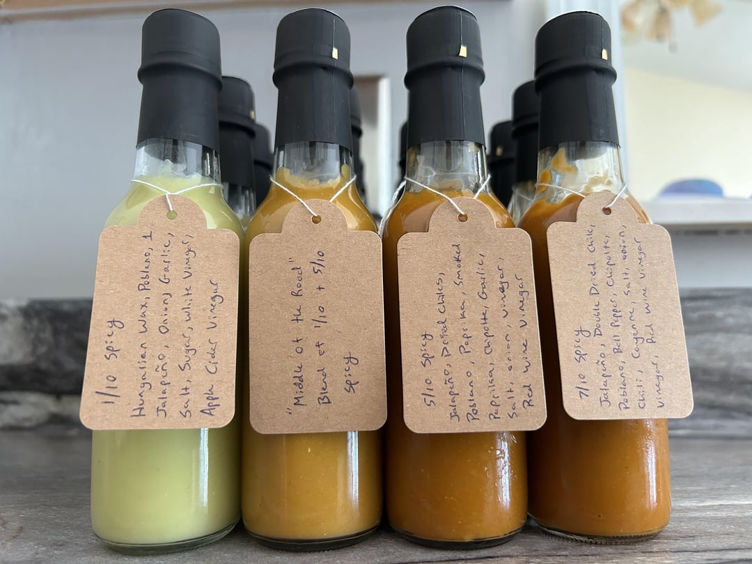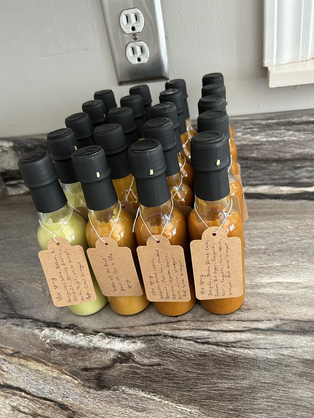 One of my coworkers brought in over 7 pounds of jalapeño, poblano, Hungarian wax and bell peppers from their garden and nobody else wanted to take them to cook with. I chose to take them home to make some small batches of different flavor profiles for them to try. They range from very mild to fairly spicy. The 1-10 scale is relative to normal people’s taste buds. Personally, I prefer hotter sauces (torchbearer garlic reaper hot) but these are still delicious and who can argue with free peppers?