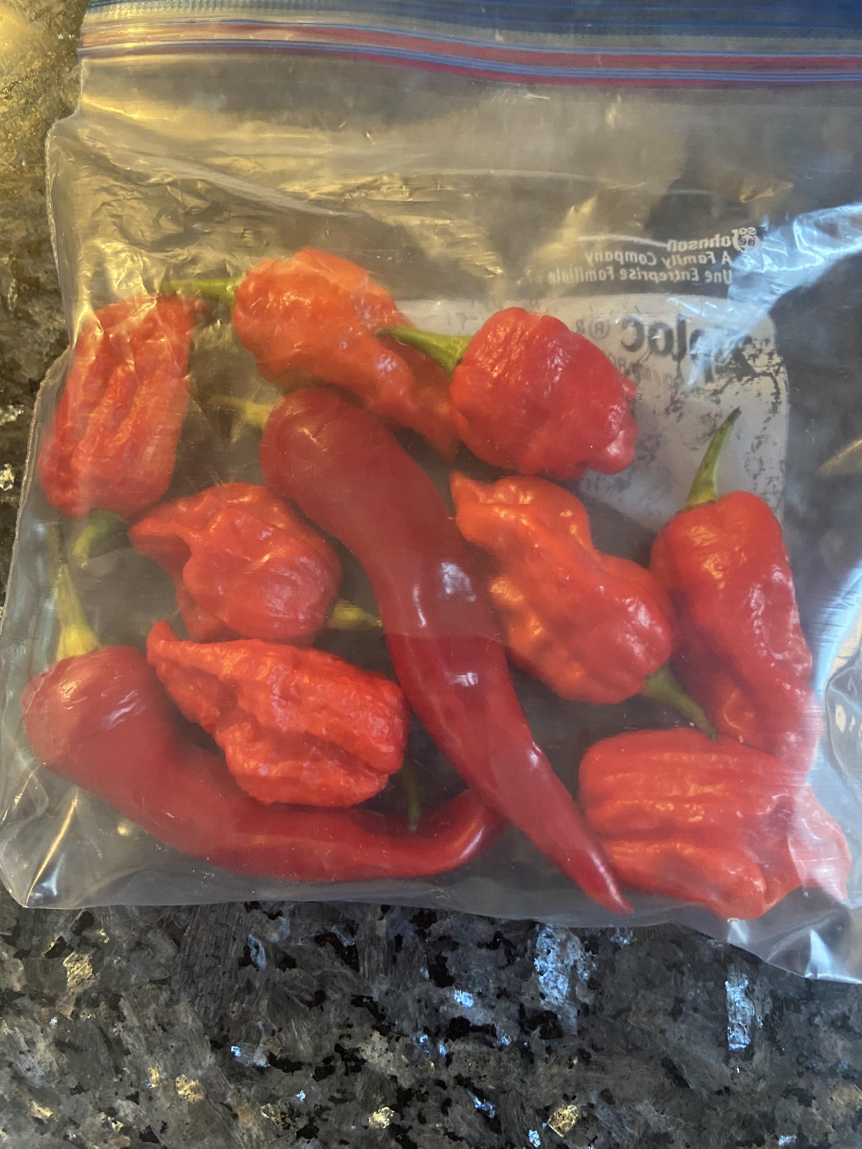 My wife brought home this bag of peppers from a woman at work. The woman that gave them to us didn’t know the names and said the light colour ones are very hot. Did she really hand us a bag of Carolina Reapers?by BreffJuice PepperPepper LoversWrite A CommentYou must be logged in to post a comment.