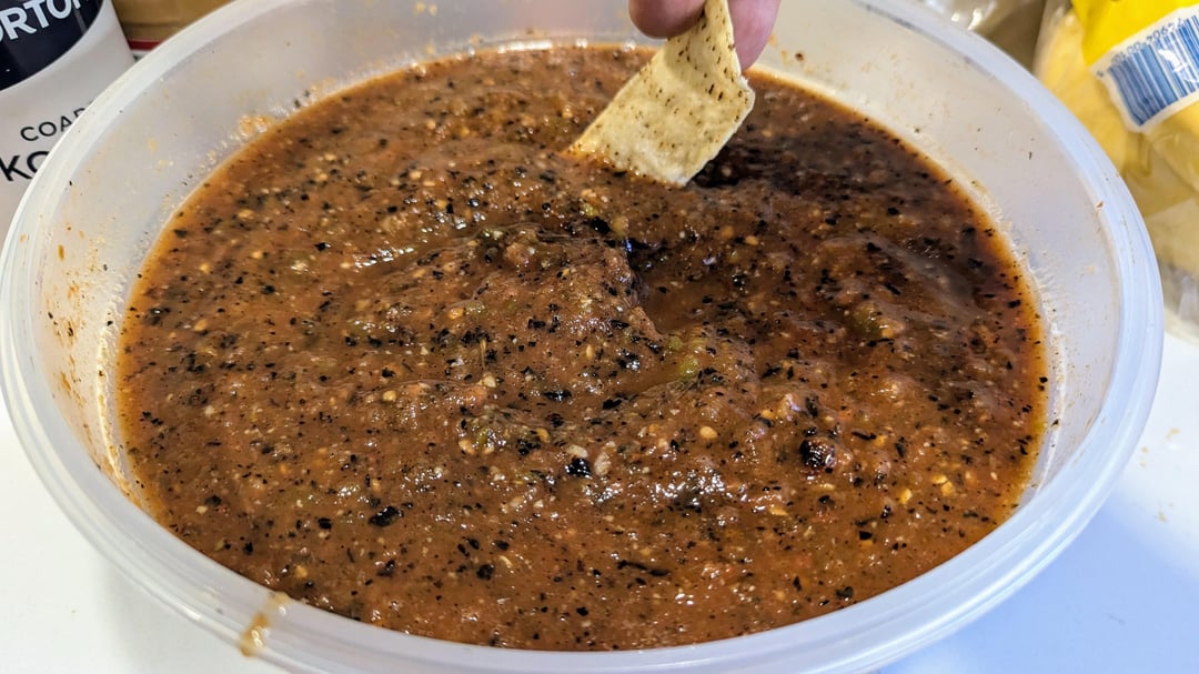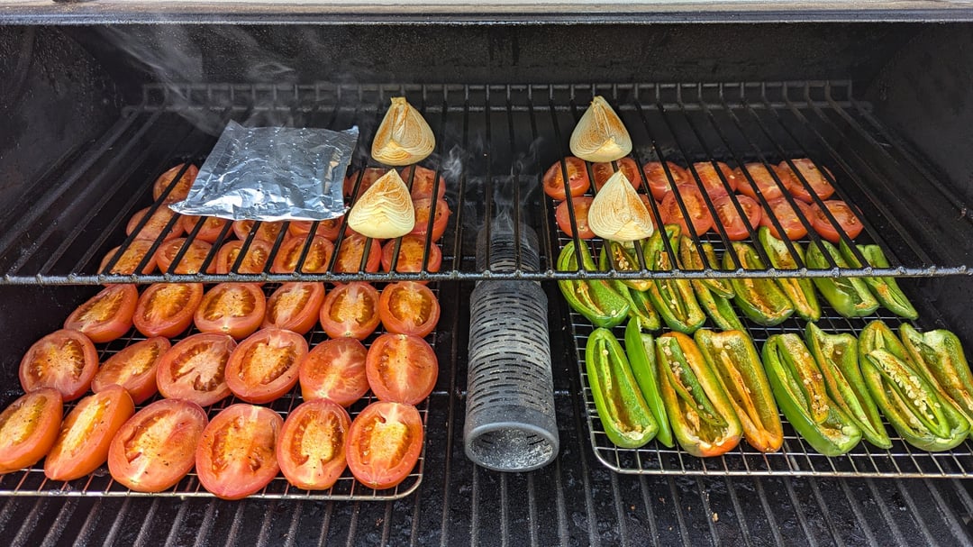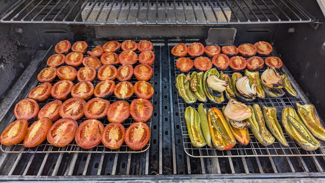 smotrs 1 year ago – 3lbs Roma – 1lb Jalapeno – 3 Serrano – 1 Onion – 1 Head GarlicSmoked at 225⁰ for 2 hrs. Charred for 5 minutes. Blended when cooled down. Salt to taste.