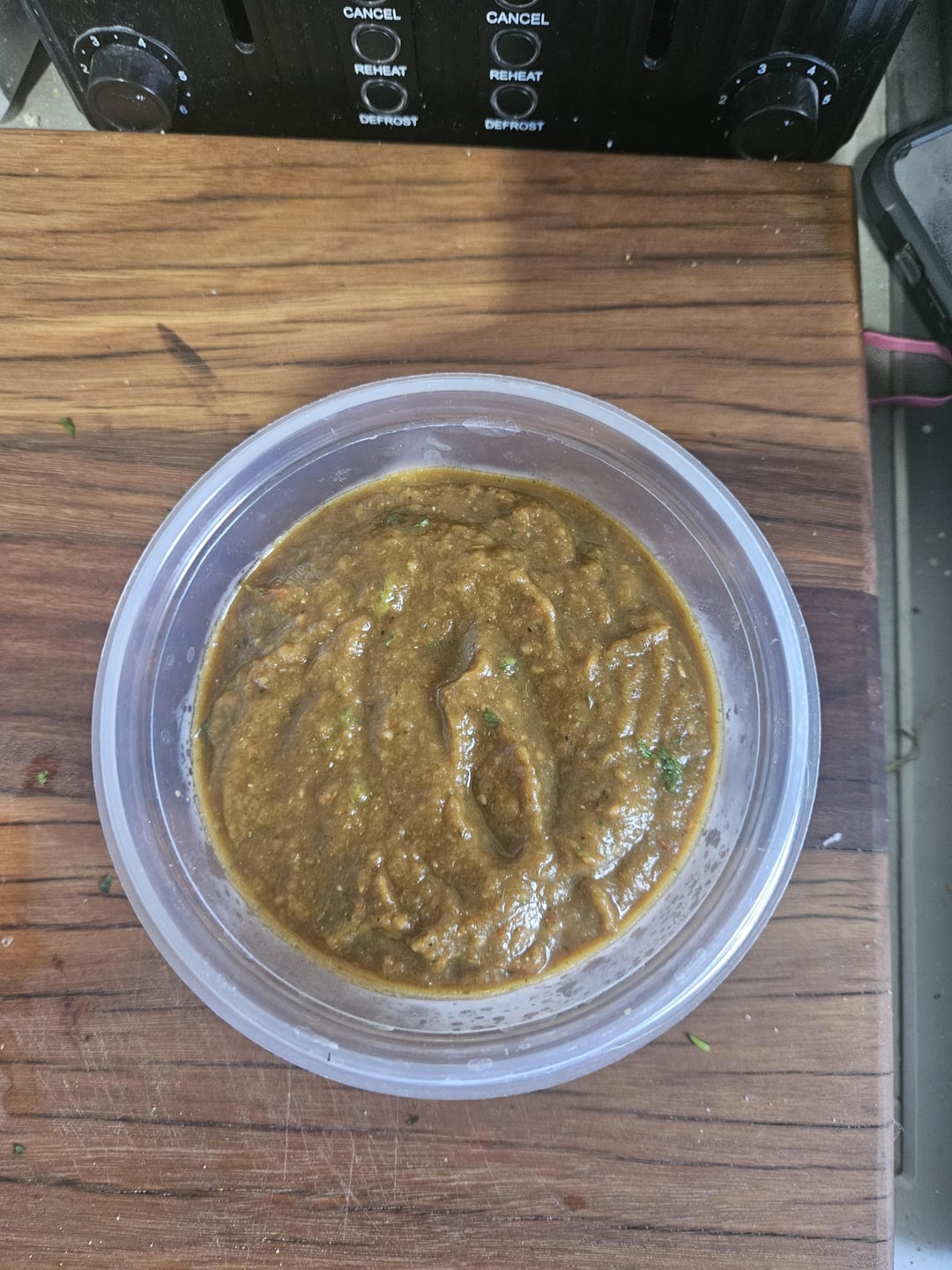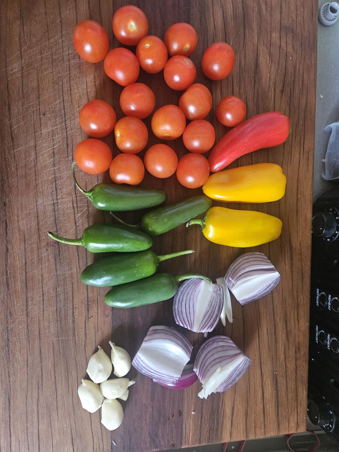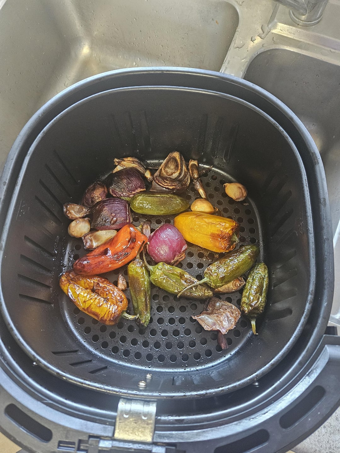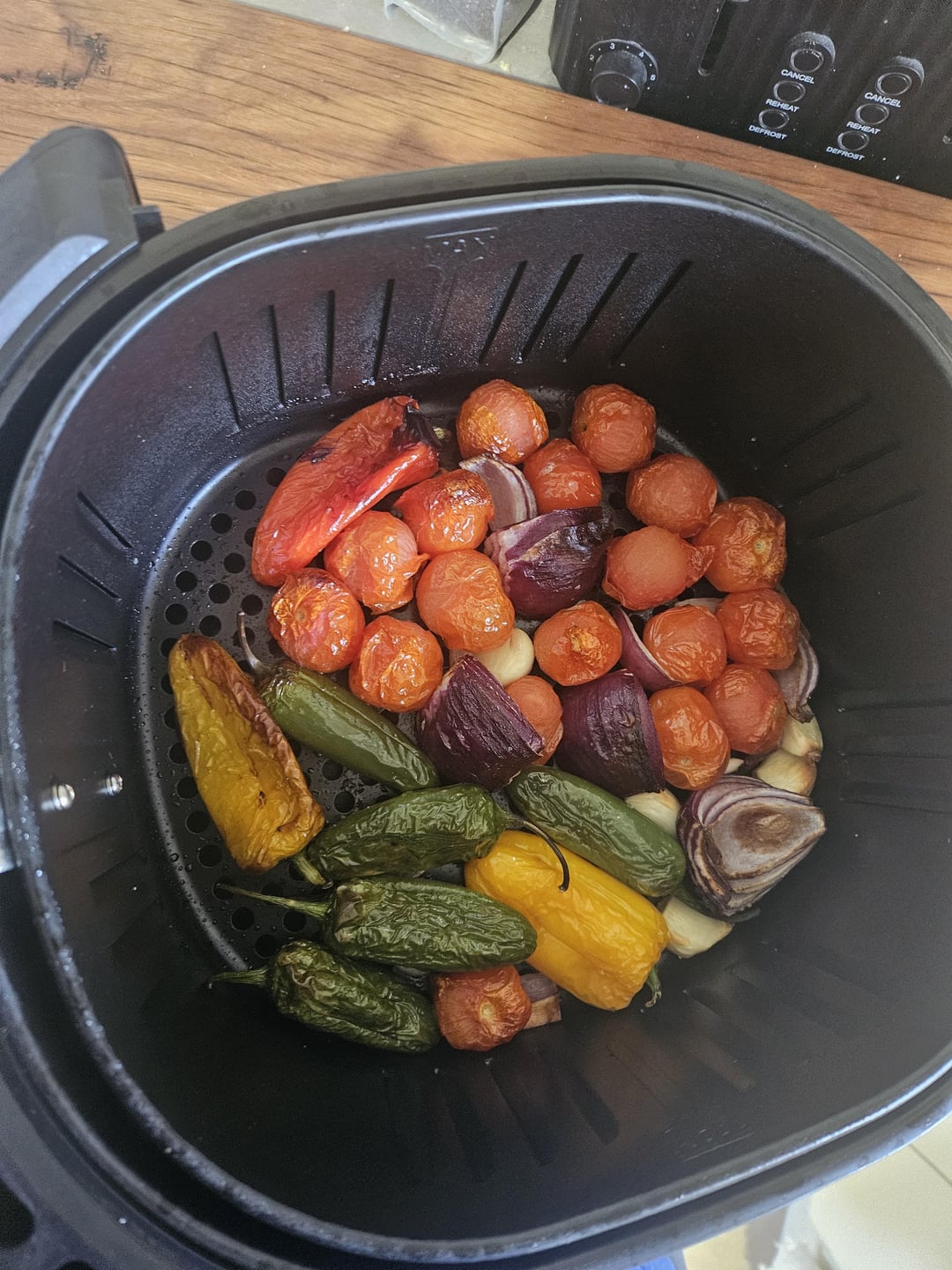 Roasted tomatoes, onion, garlic, jalapenos, capsicum in air fryer about 5 odd min with tomato and an extra 5 min without tomatoes.