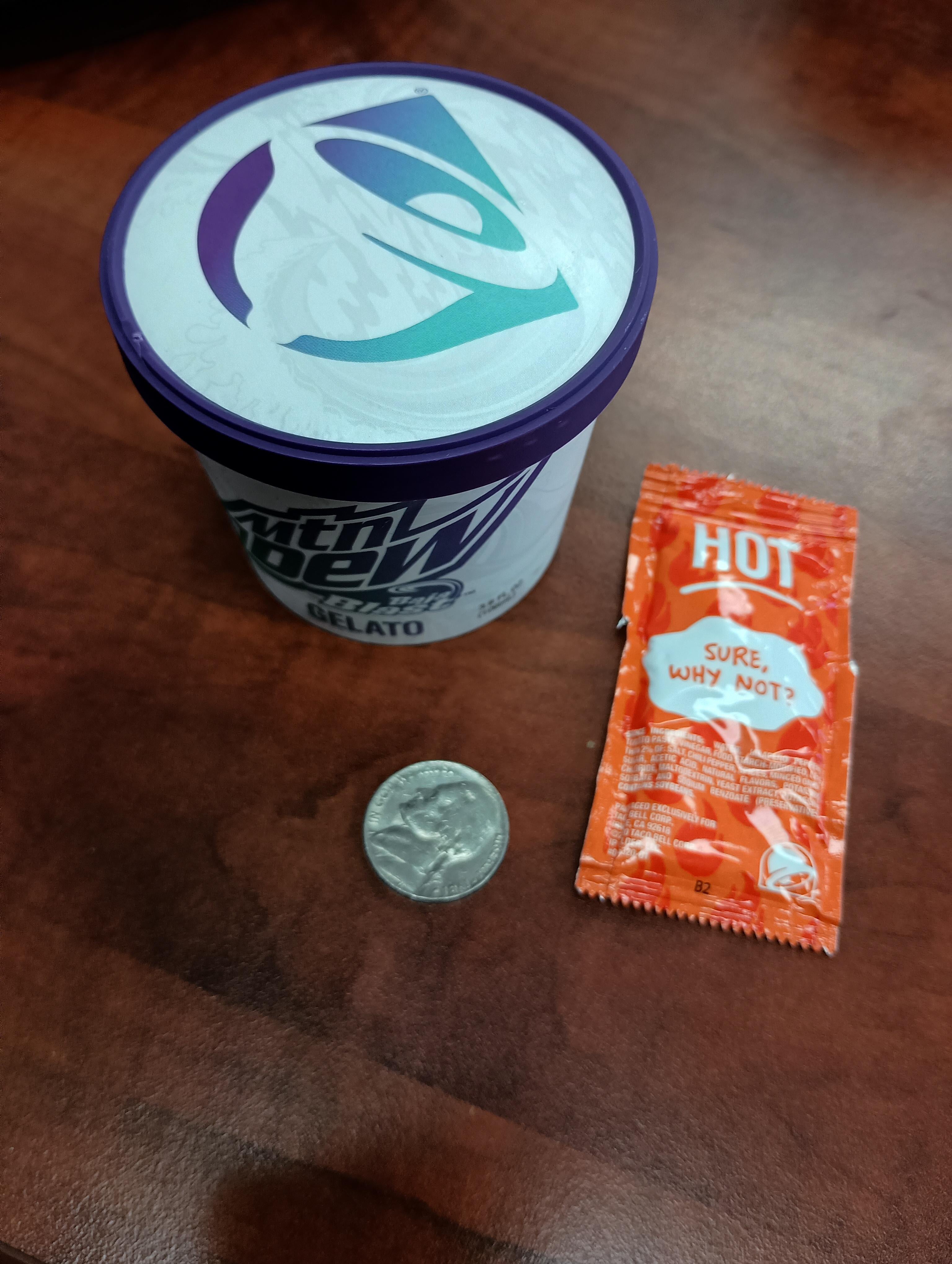 What a ripoff, 106 ml for $4.50. sauce packet and nickel for scale. Somehow it still looks bigger in this picture than in real life.