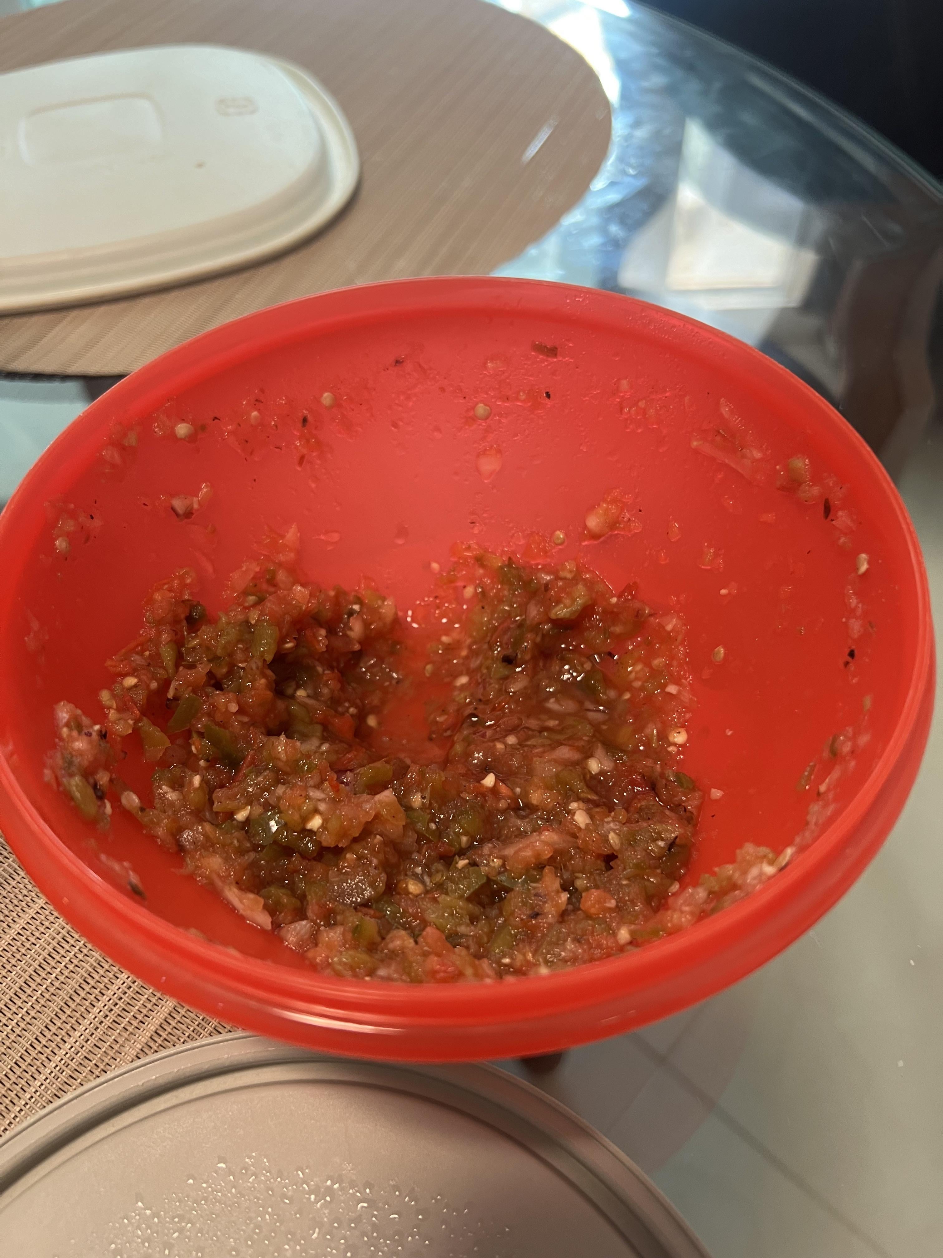 2 house tomatoes 4 Roma Hatch green chilis from New Mexico Serrano Jalapeño Goya seasoning Salt White onion Purple onion by Maleficent_Fee_8154 pico de gallosalsaSauceWrite A CommentYou must be logged in to post a comment.