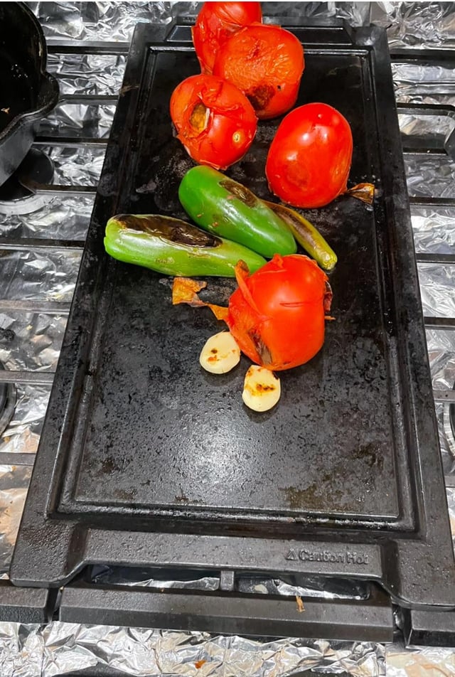 • Remove ingredients from griddle and set aside. Peel most of the dark burnt skin off of the tomatoes and chiles. You can leave a little bit for the smoky flavor. Peel the garlic.
