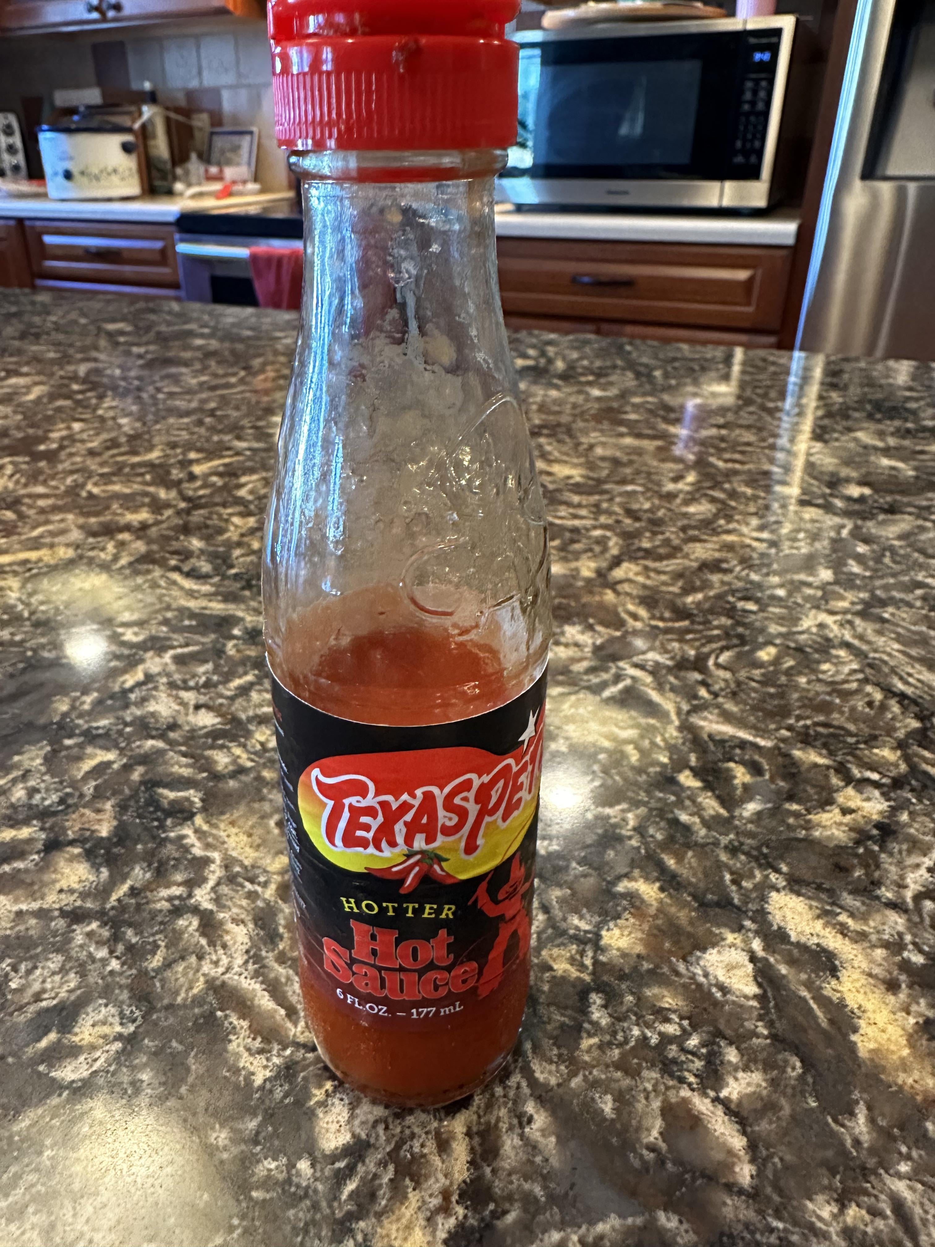 It isn’t much, but it’s always here when I visit. The “hotter” variety of Texas Pete has a bit of a kick to it.