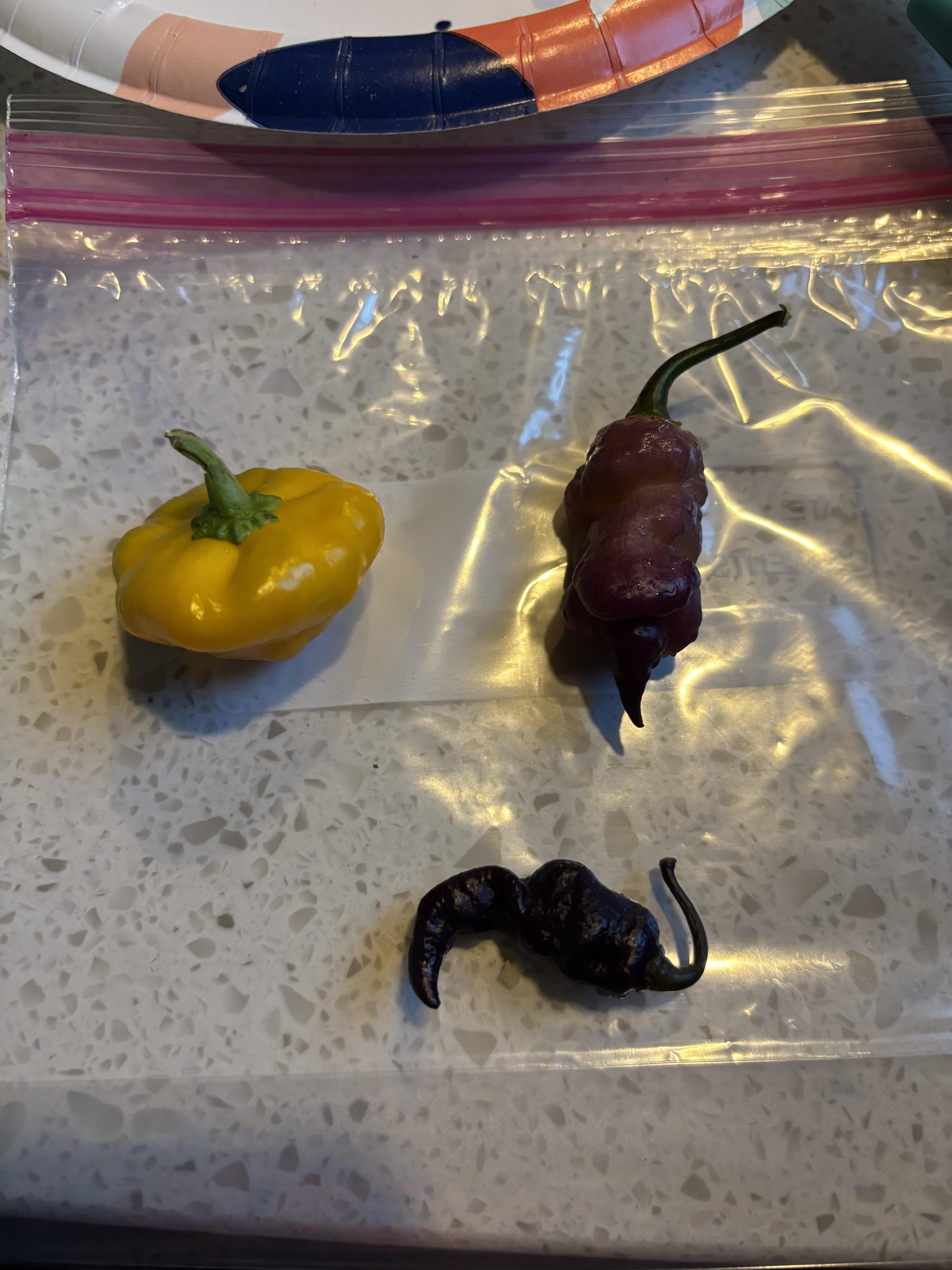 Buddy gave me some peppers, no idea what they are. The purple one top left is super hot
