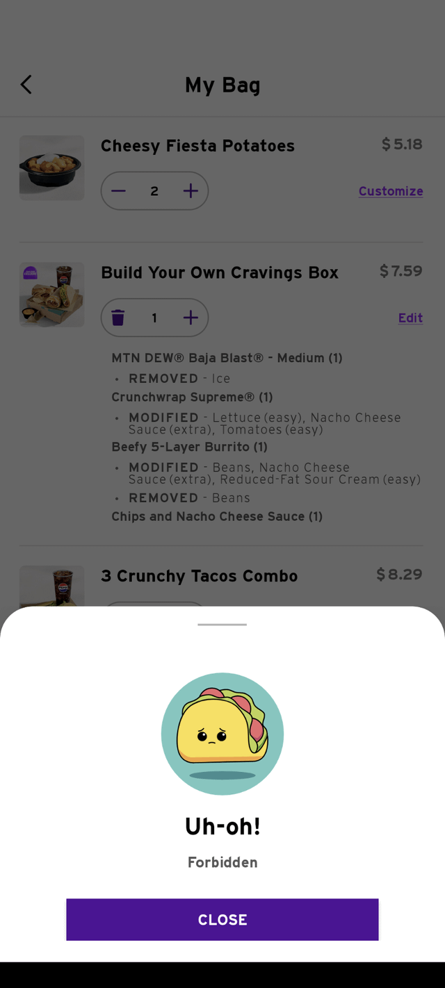 I used to get the uh oh then it stopped, and the last two orders it started again. It says there is no card selected. So I click my card that is already there and then it works.