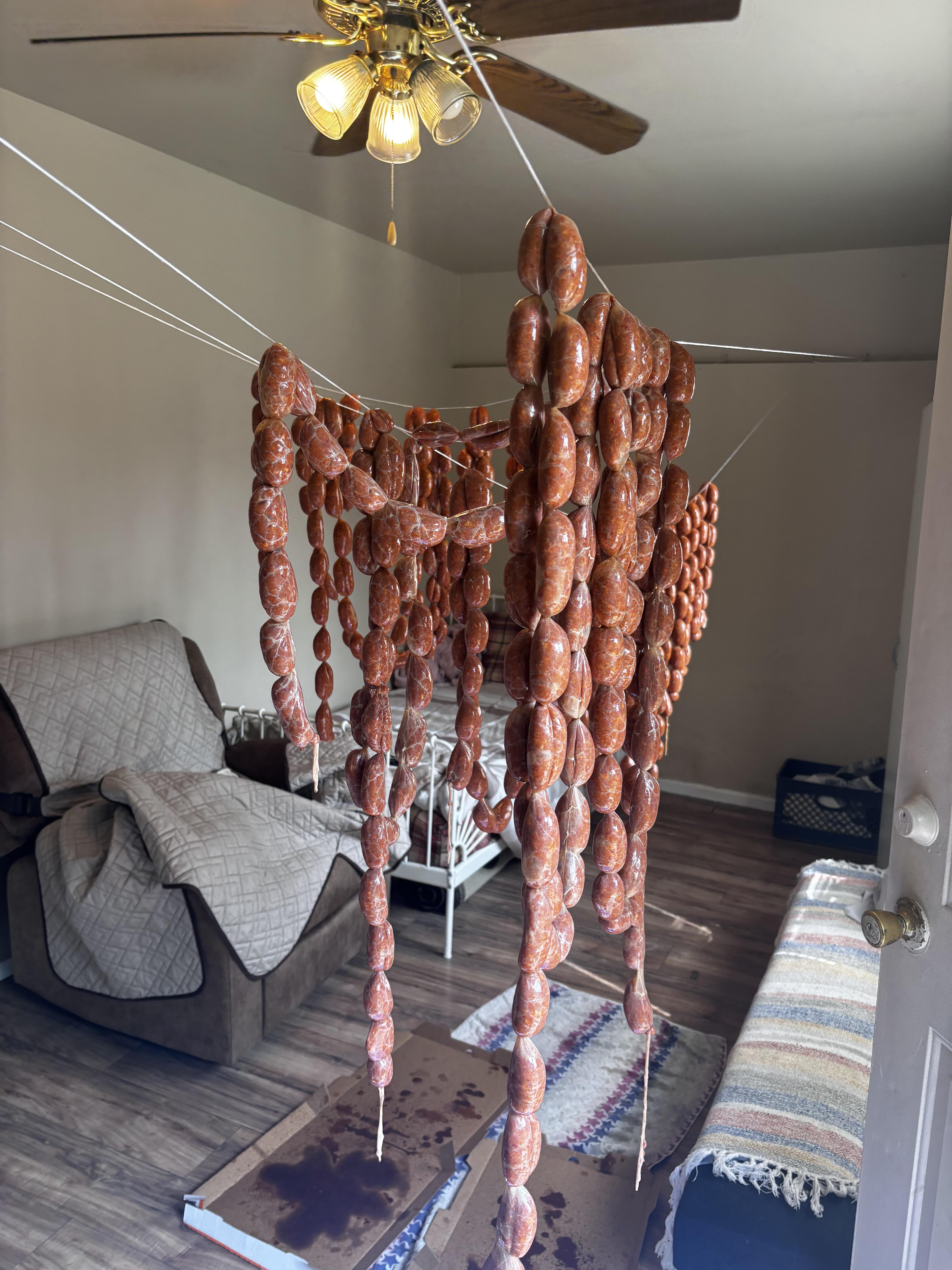 I love that there is not a single picture or fixture on the walls, but chorizo is hanging. Priorities.