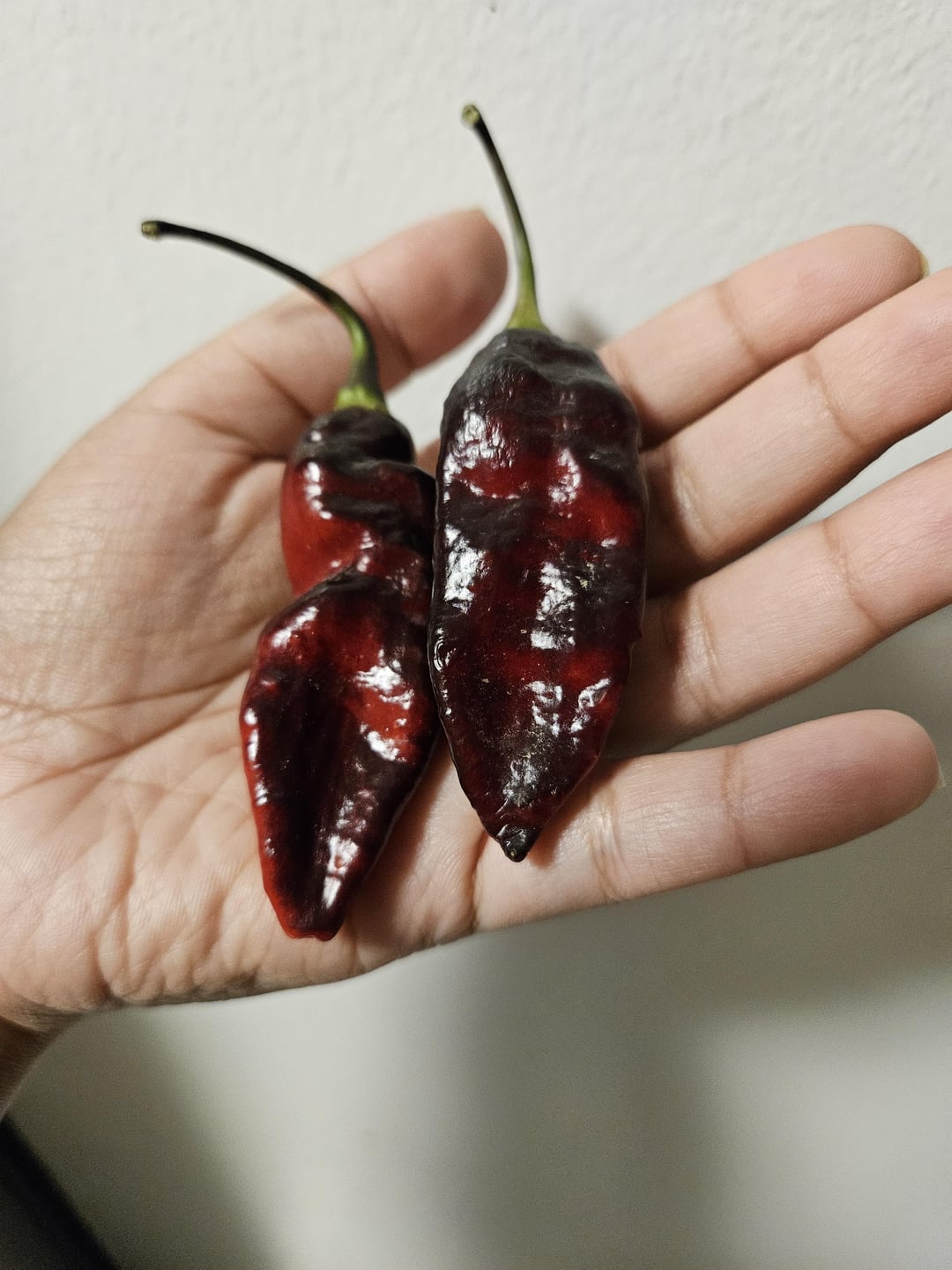 My best guess for the second picture is Black Bhut Jolokia, but I'm having a hard time with the peppers in the first picture.