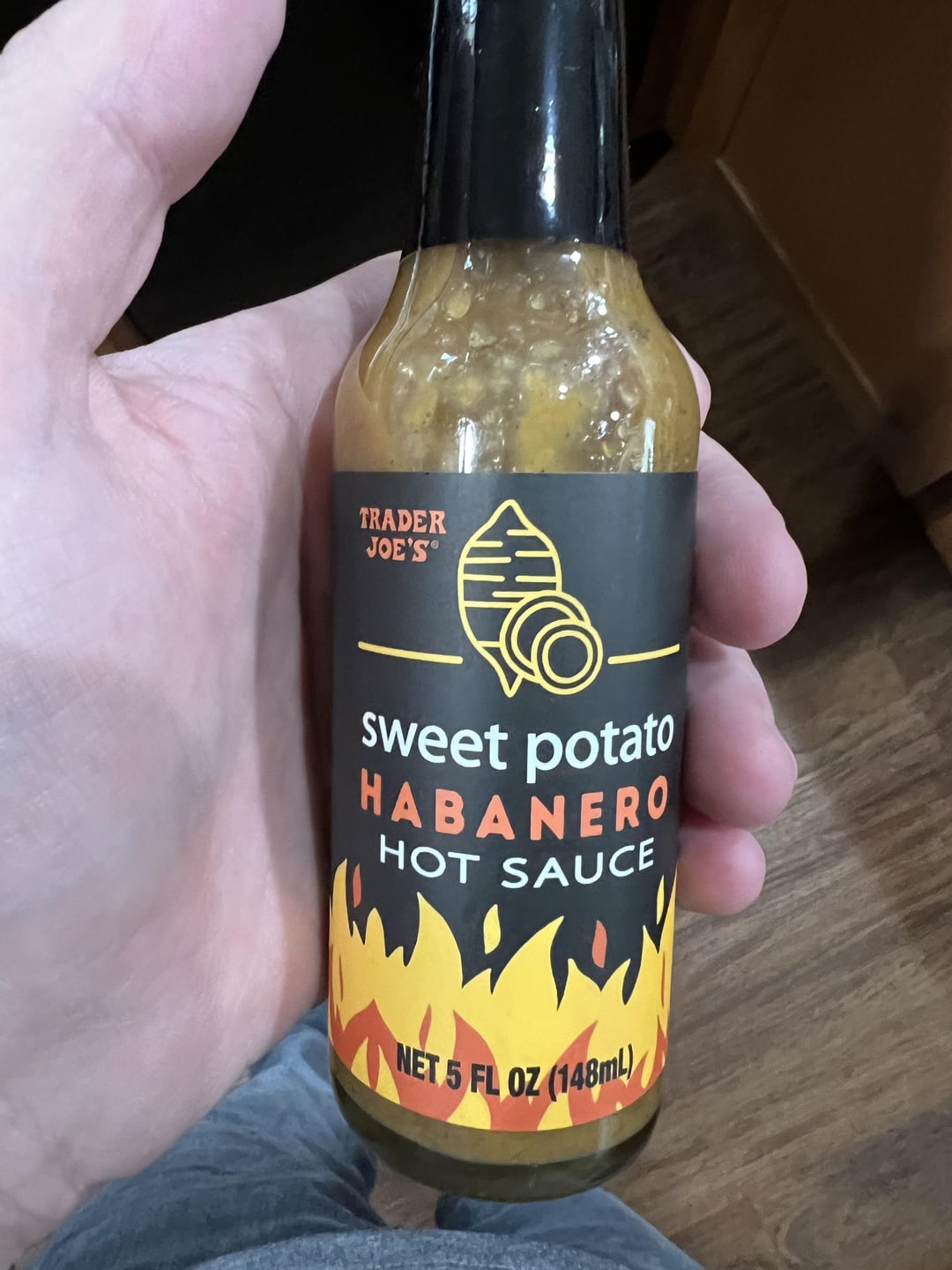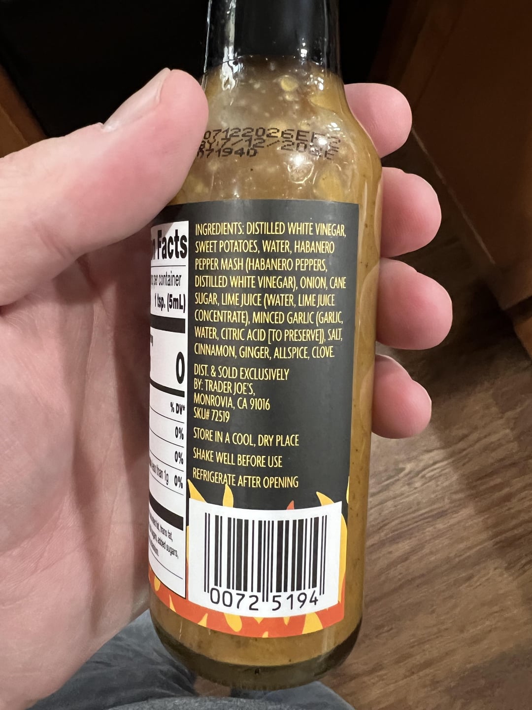 Tastes great, but I wish it was puréed more thoroughly. I don’t like how it kind of plops out of the bottle in clumps. Also, I’m no hothead, as this was my first habanero sauce, but I suspect this isn’t really representative of habanero’s true heat. Based on the tiny bottle I was expecting a little bit to go a long way, but I’d rate it at about the same level of heat as Sky Valley sriracha, which is about the hottest sauce in my typical rotation.