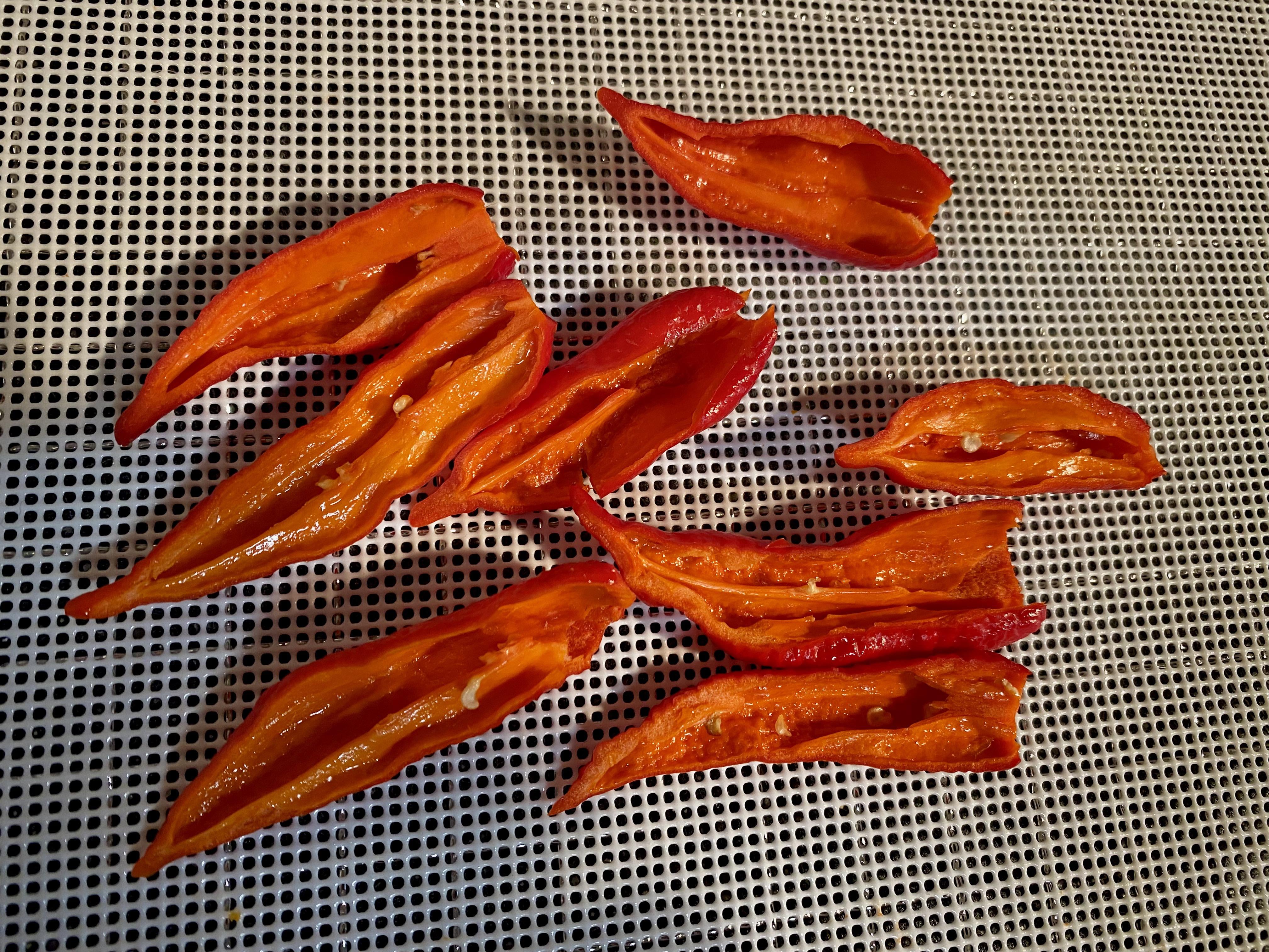 Dehydrating to make powder. Only a few here. I dry as I pick. My eyes and nose are on fire from the combined fumes from the other peppers. In the garage with the dehydrator, I gotta leave soon lol. Looks like I'll end up with about 75 in total from two first-year plants. May overwinter them, or at least one. They were healthy all summer long.