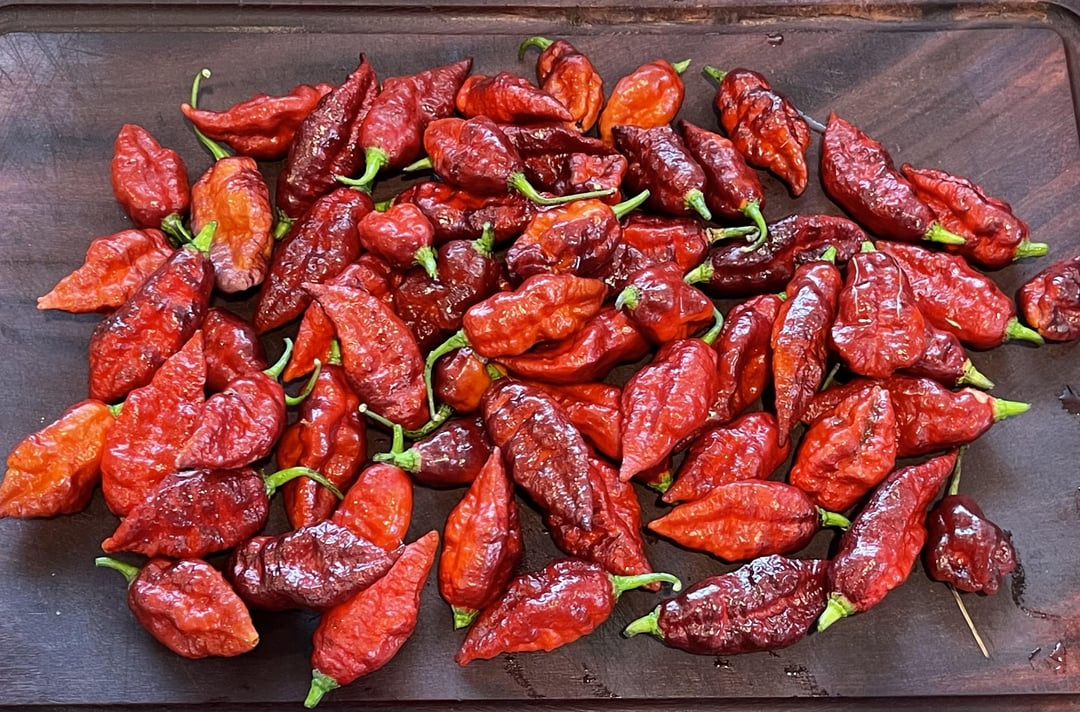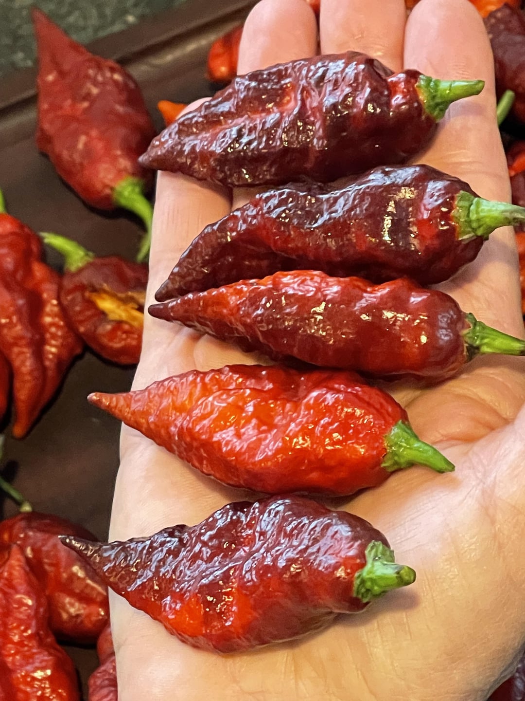 This is one of the phenotypes we’re getting from the Taj Mahal Red Minion F3. These chilis are going into a mash for storage. All our freezers are full to the brim. I’m beginning to think freezing isn’t an optimum choice to preserve peppers.