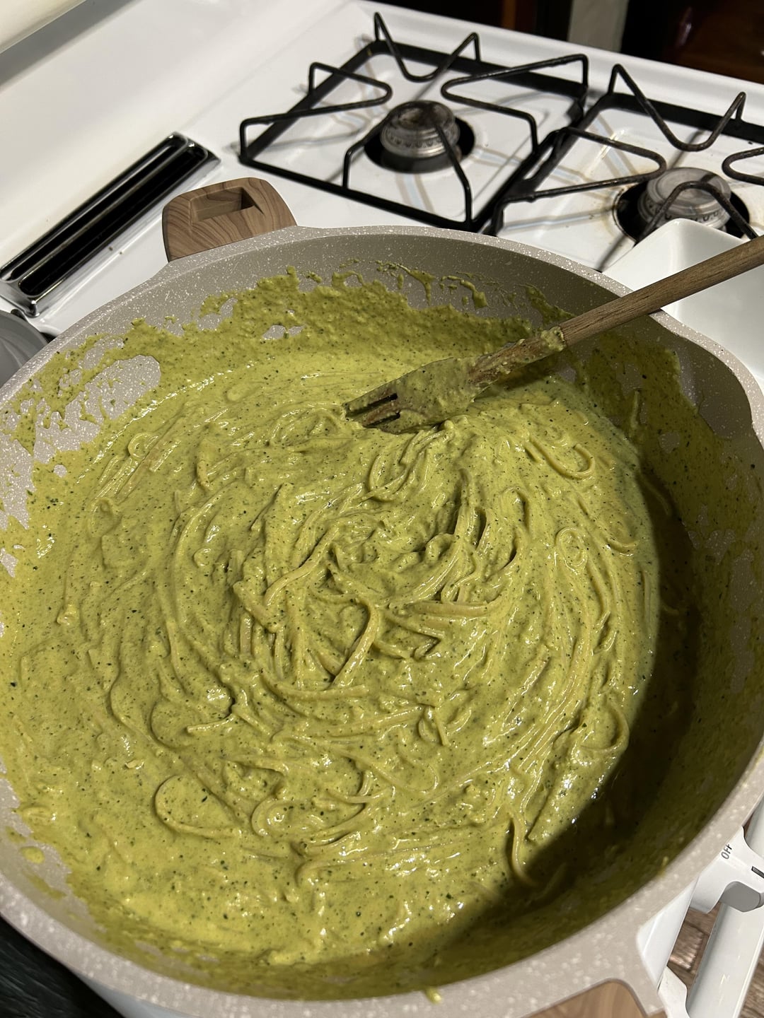 Creamy poblano tomatillo sauce, linguine and vermicelli, Andy’s Cajun seasoning crunchy breast strips.by hopelesshillbilly Write A CommentYou must be logged in to post a comment.